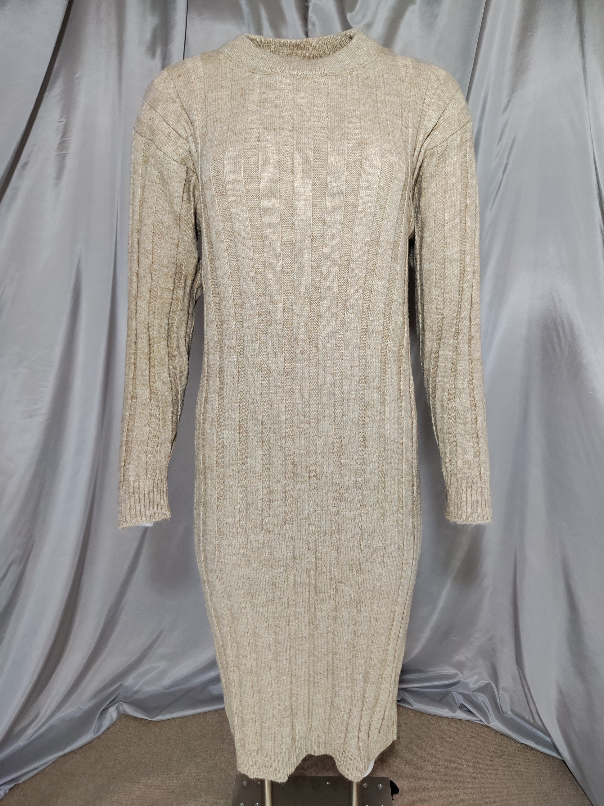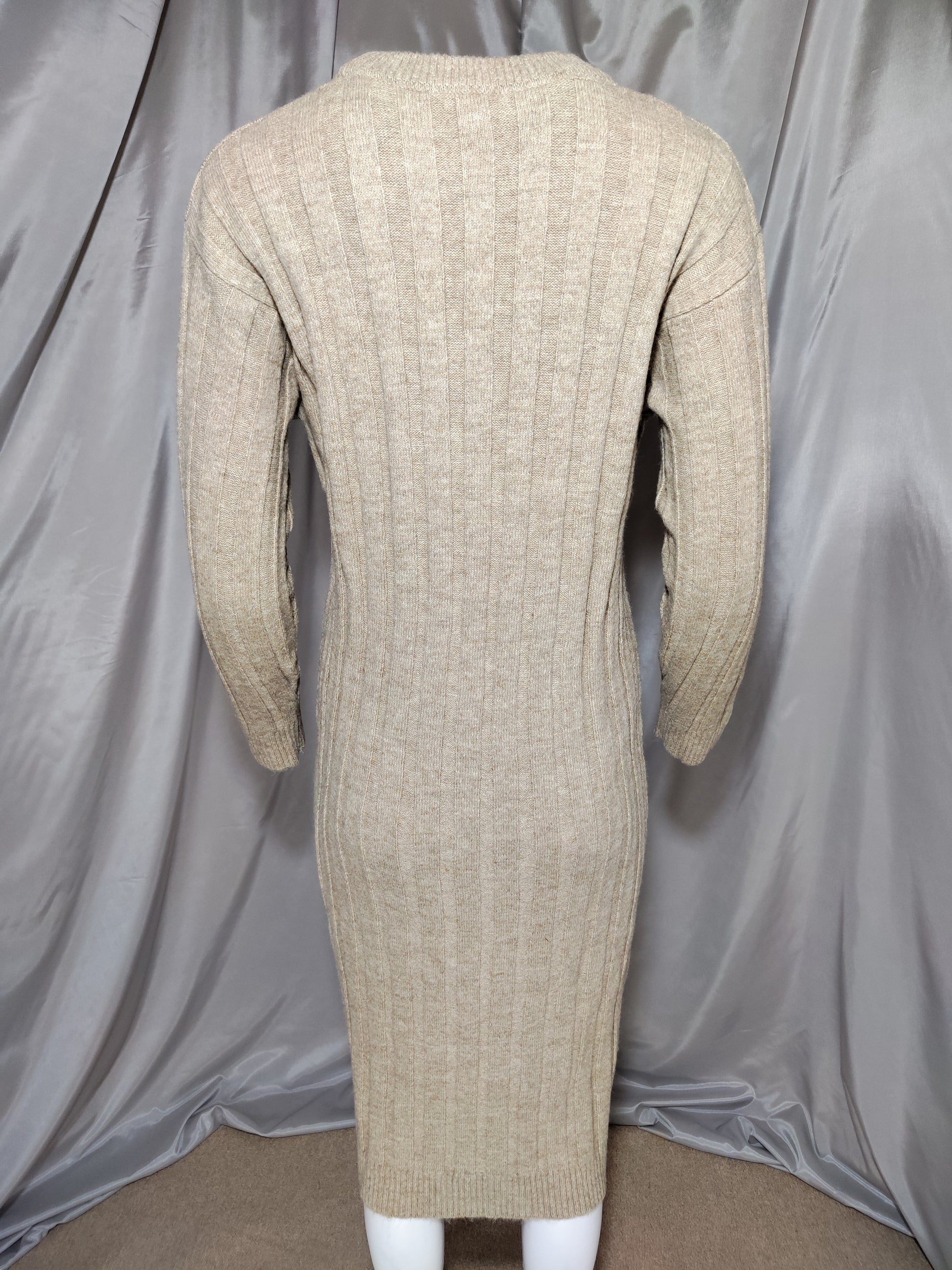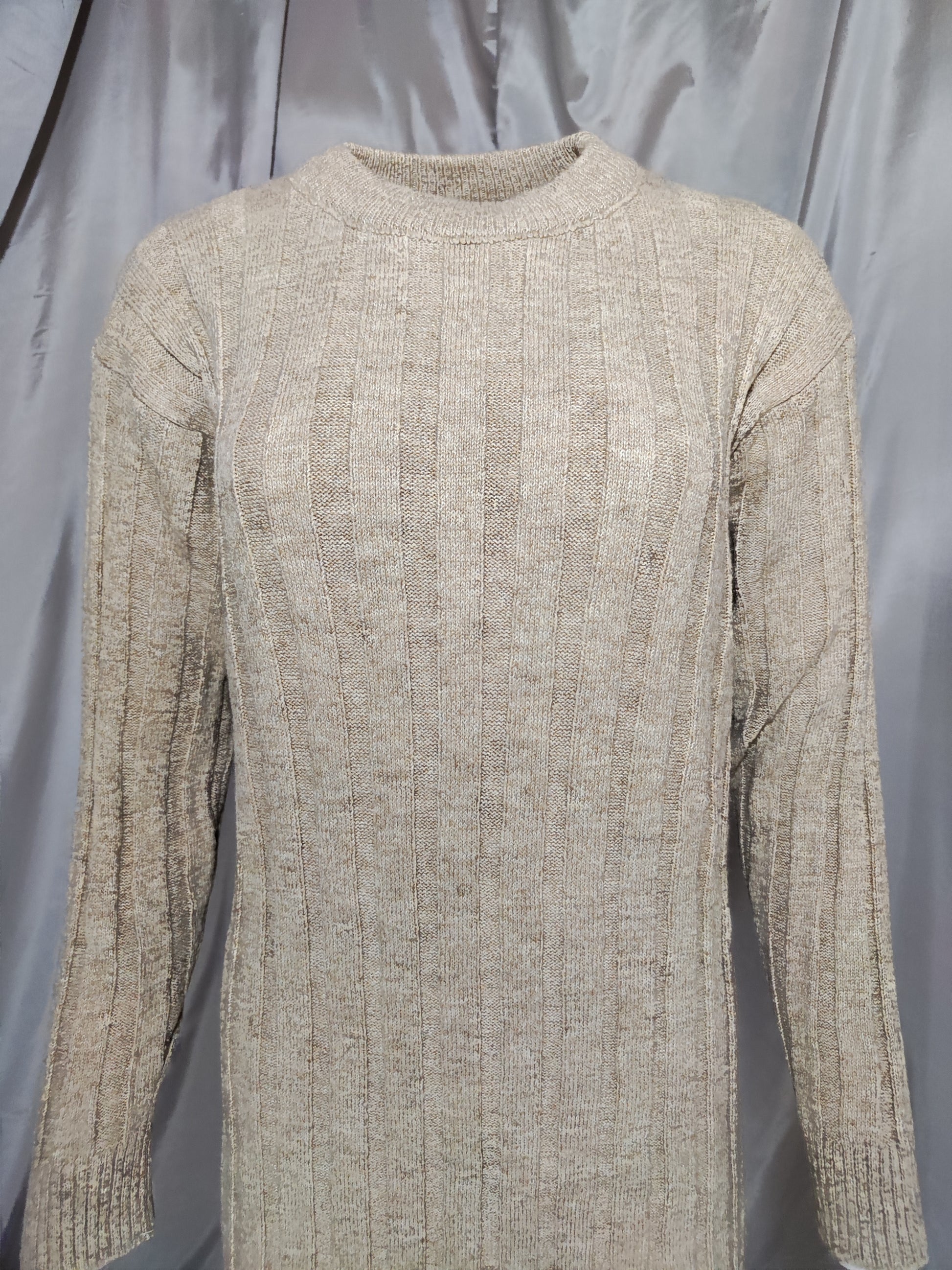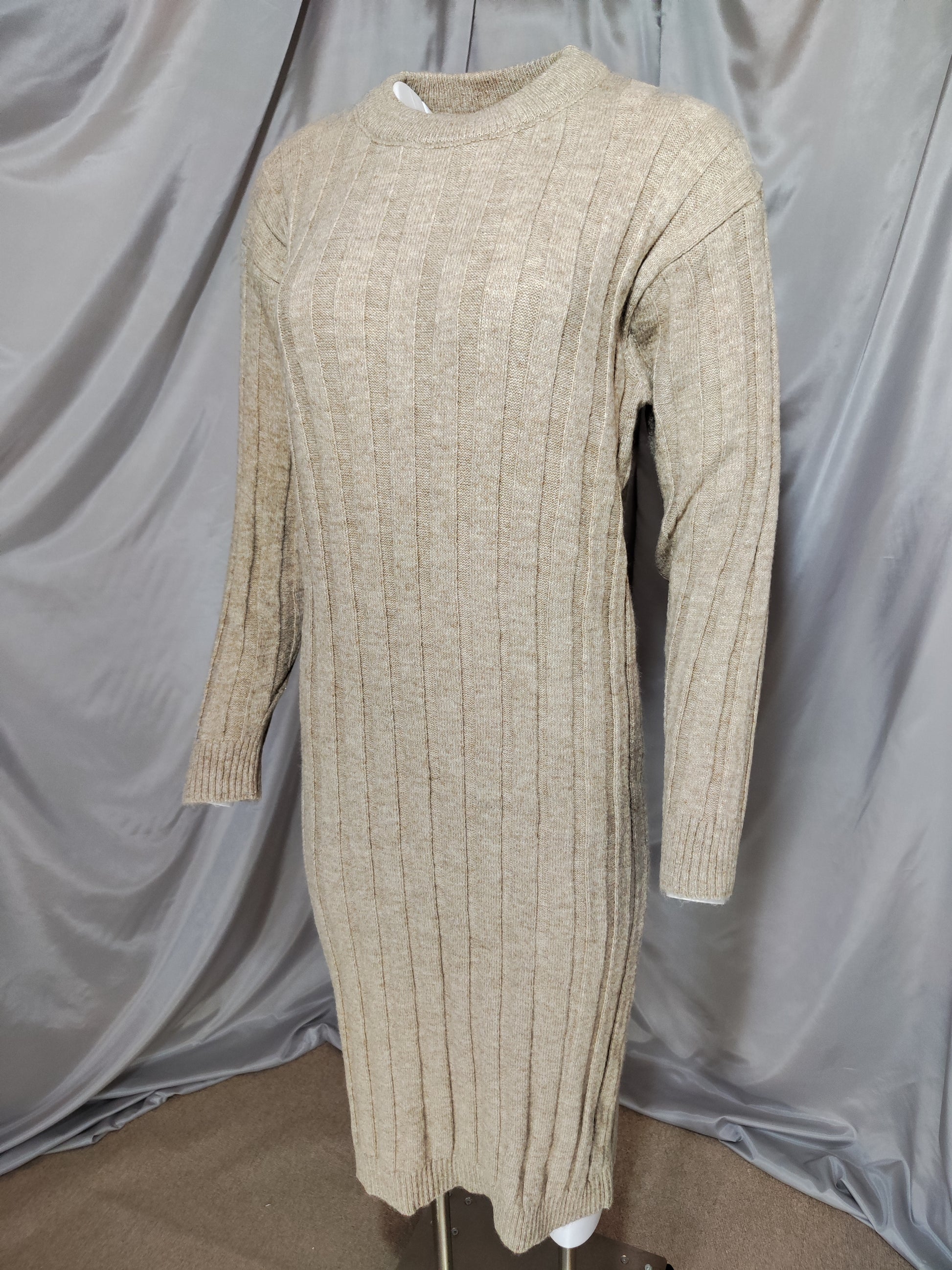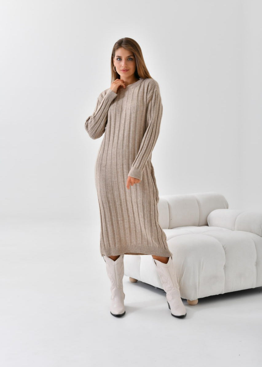 Haljina dolazi u bež nijansi s decentnim prugastim uzorkom koji vizualno izdužuje figuru. Duži kroj i dugi rukavi daju joj jednostavan, a istovremeno elegantan izgled. Pleteni materijal pruža toplinu i mekoću, što je čini savršenim izborom za udobne, ali uredne odjevne kombinacije.