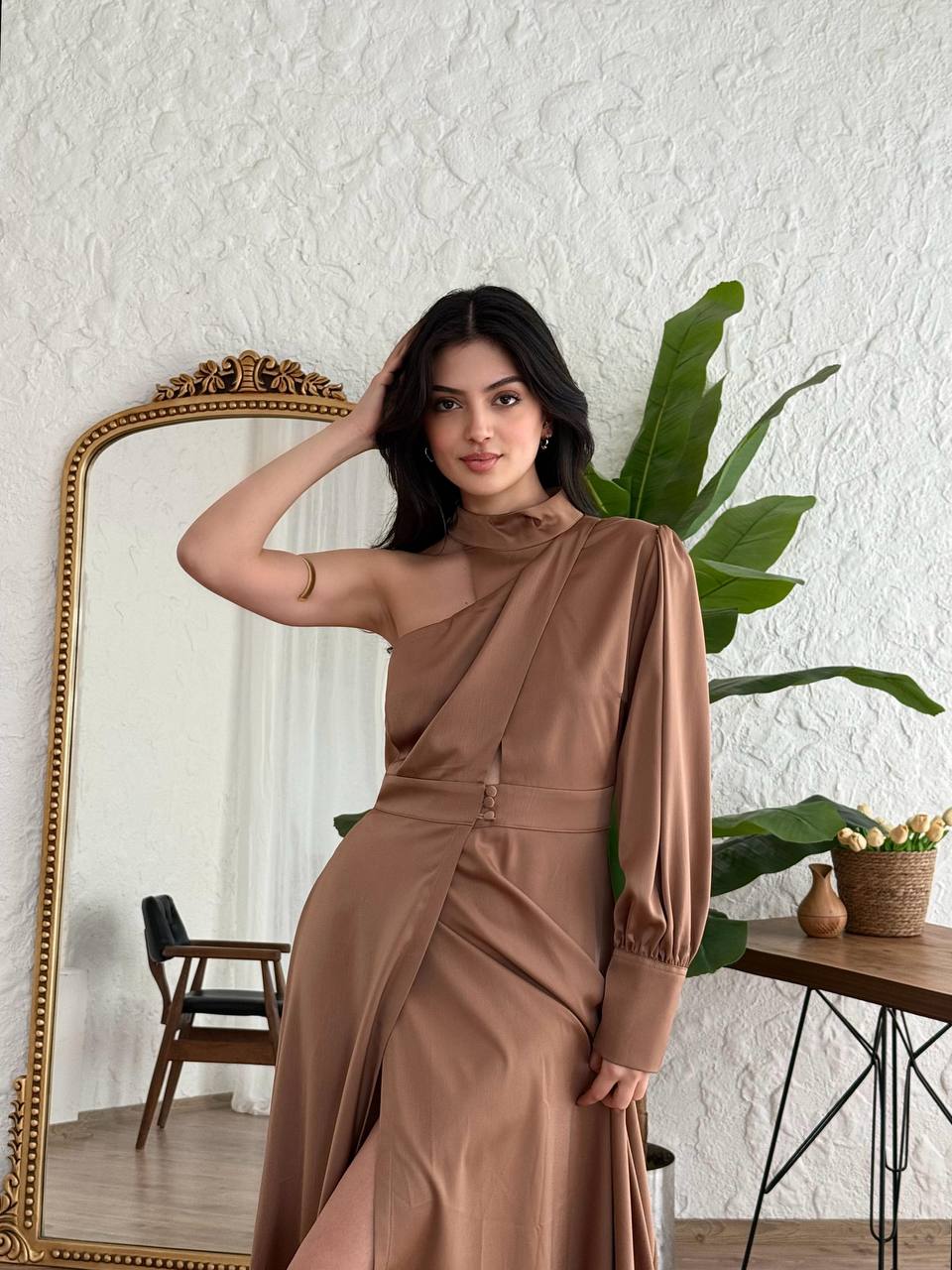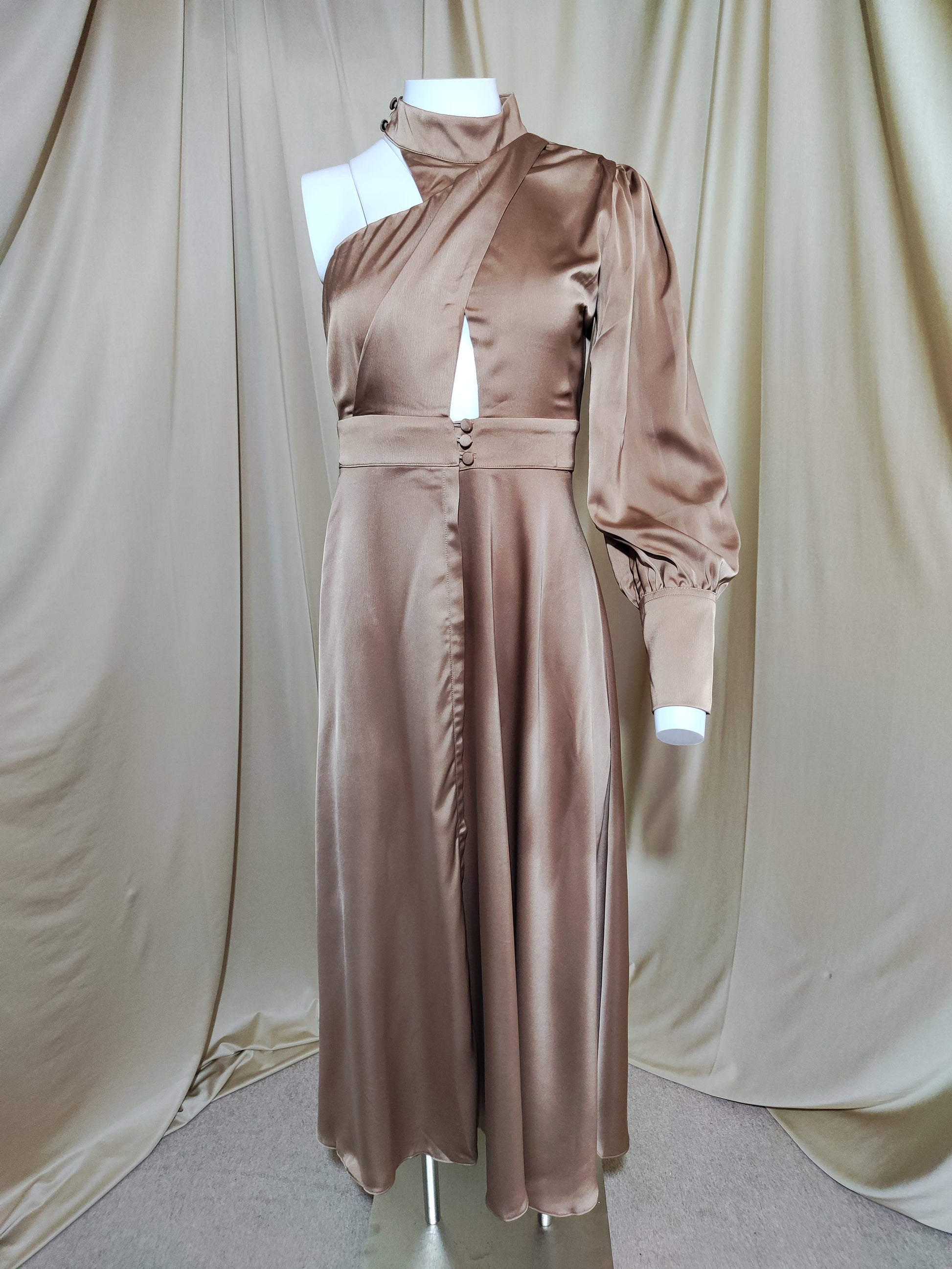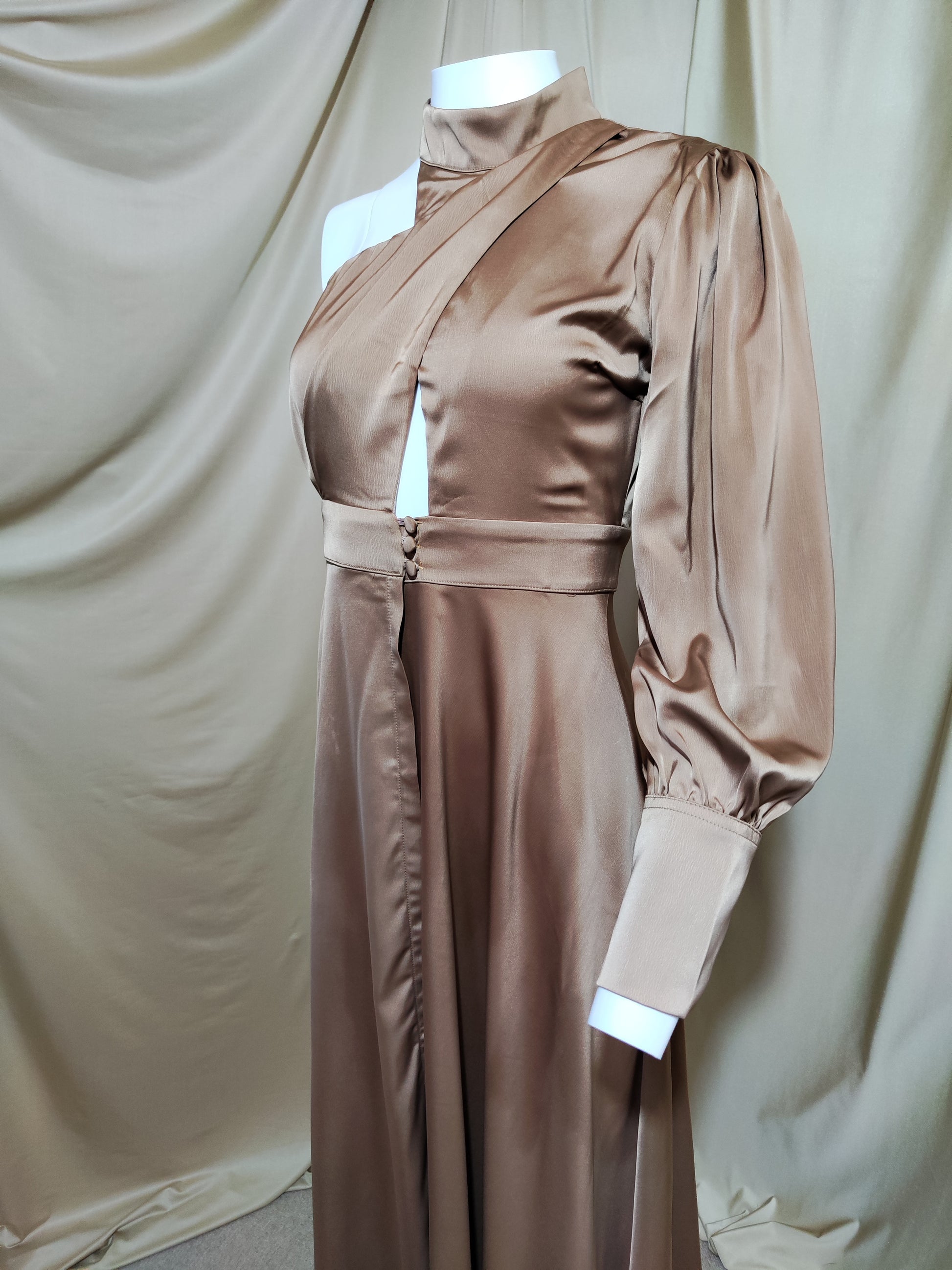 Elegantan satenski model u bež boji s asimetričnim krojem i visokim ovratnikom. Poseban detalj je otkriveno rame u kontrastu s dugim puf rukavom, što haljini daje jedinstven i sofisticiran izgled.