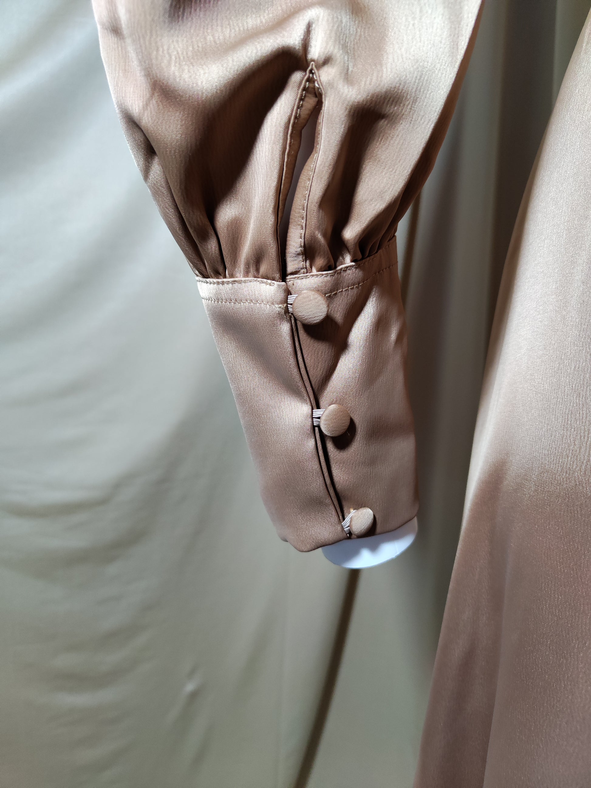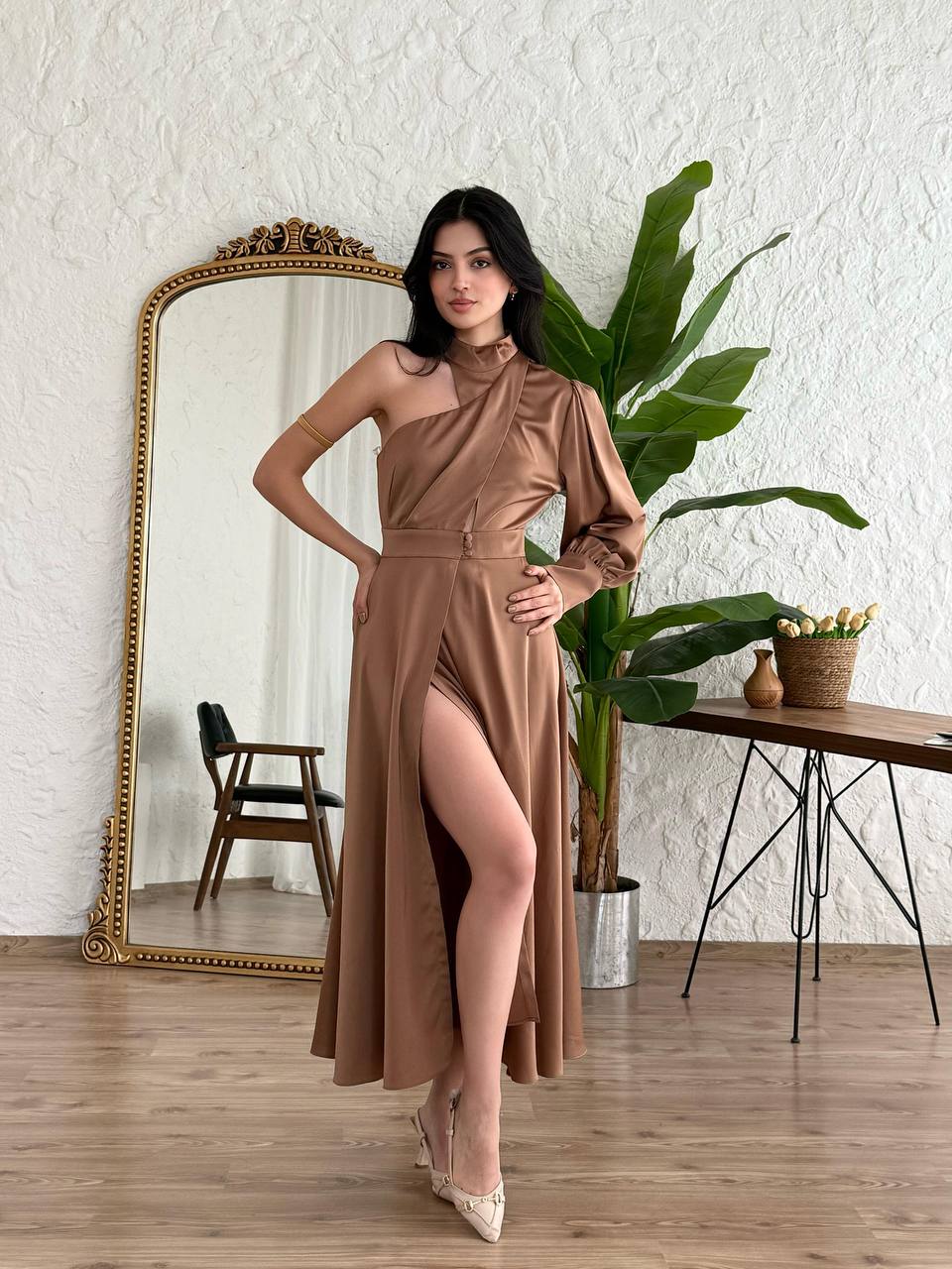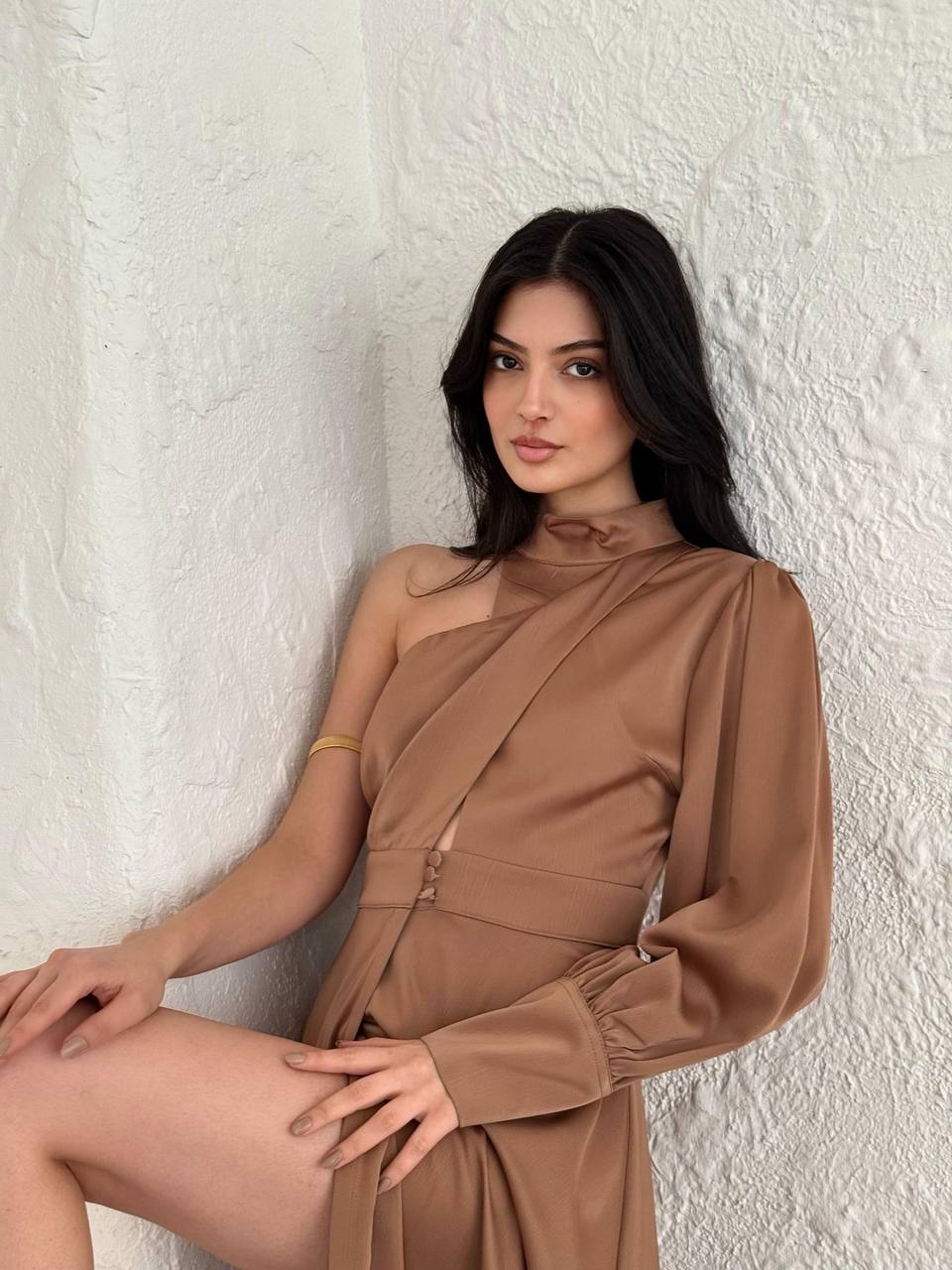 Elegantan satenski model u bež boji s asimetričnim krojem i visokim ovratnikom. Poseban detalj je otkriveno rame u kontrastu s dugim puf rukavom, što haljini daje jedinstven i sofisticiran izgled.