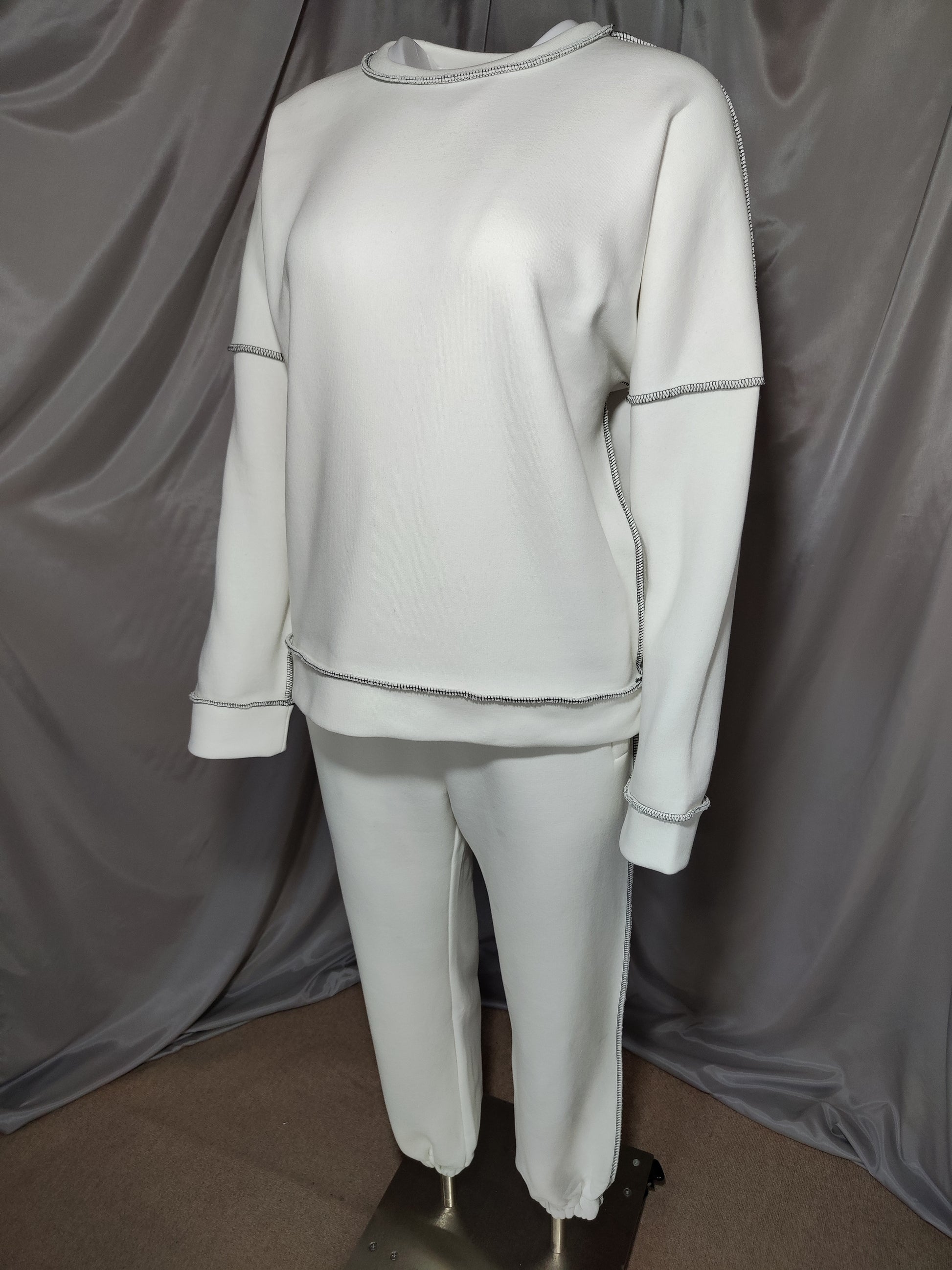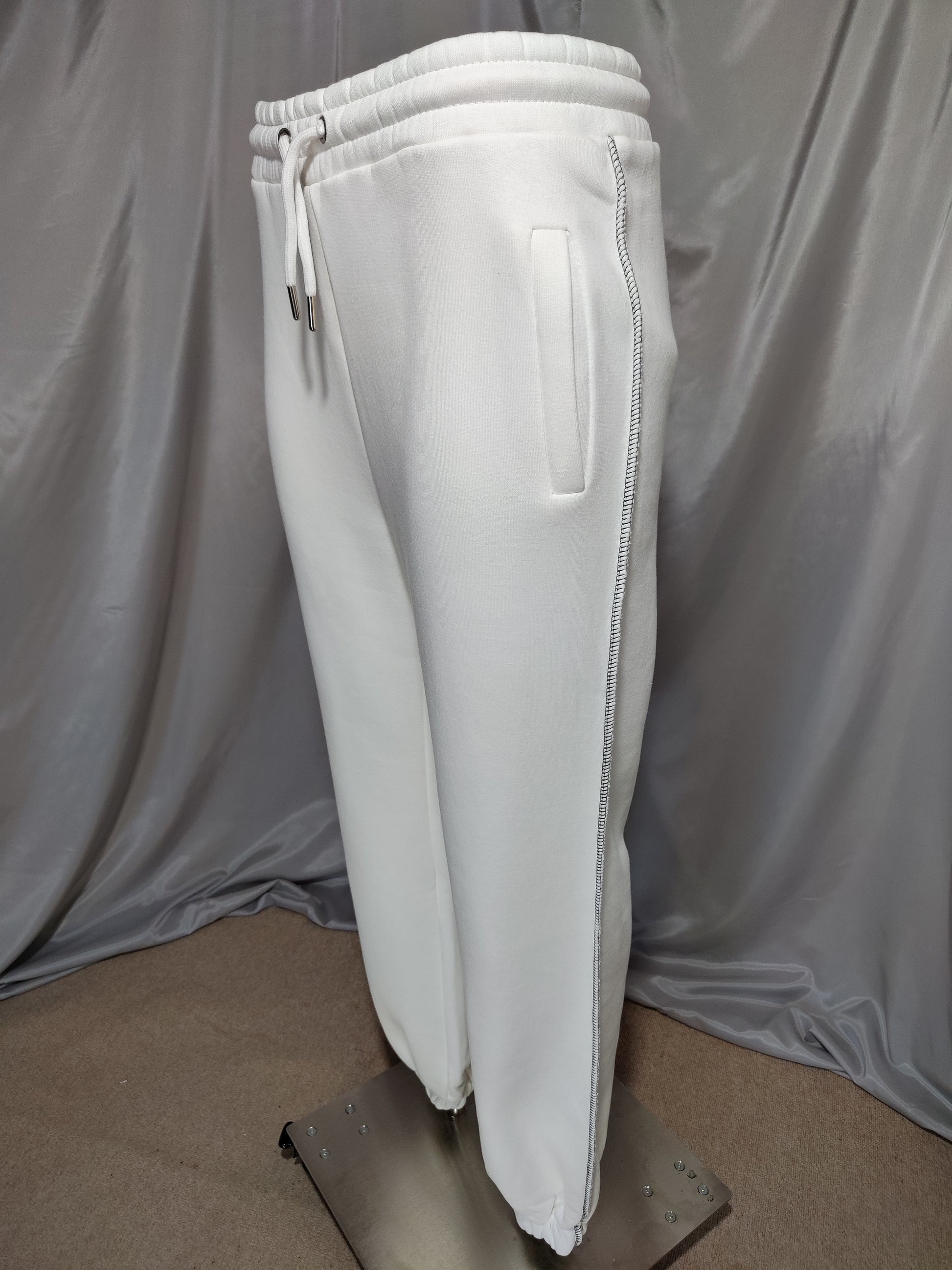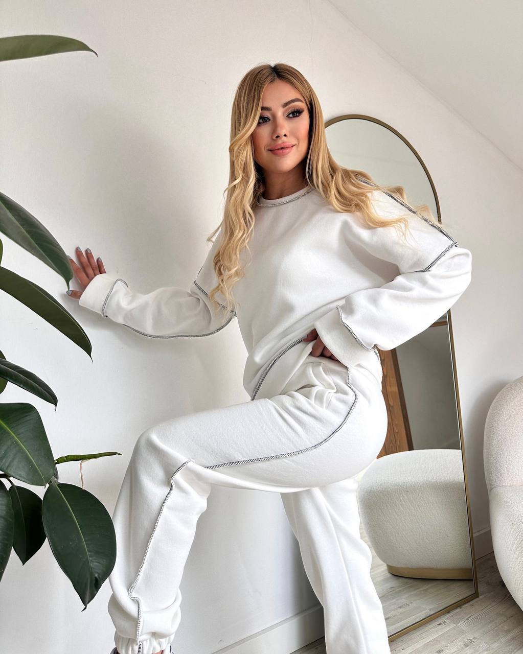 Moderna trenirka u bijeloj boji, izrađena od mekanog i udobnog materijala. Gornji dio s dugim rukavima i ukrasnim kontrastnim šavovima daje elegantan, ali ležeran izgled. Donji dio ima elastičan pojas s vezicom, praktične bočne džepove i nogavice završene lastikom za udobno prianjanje.