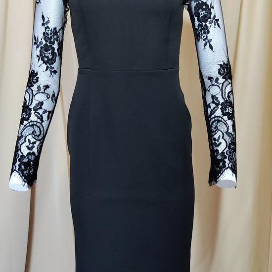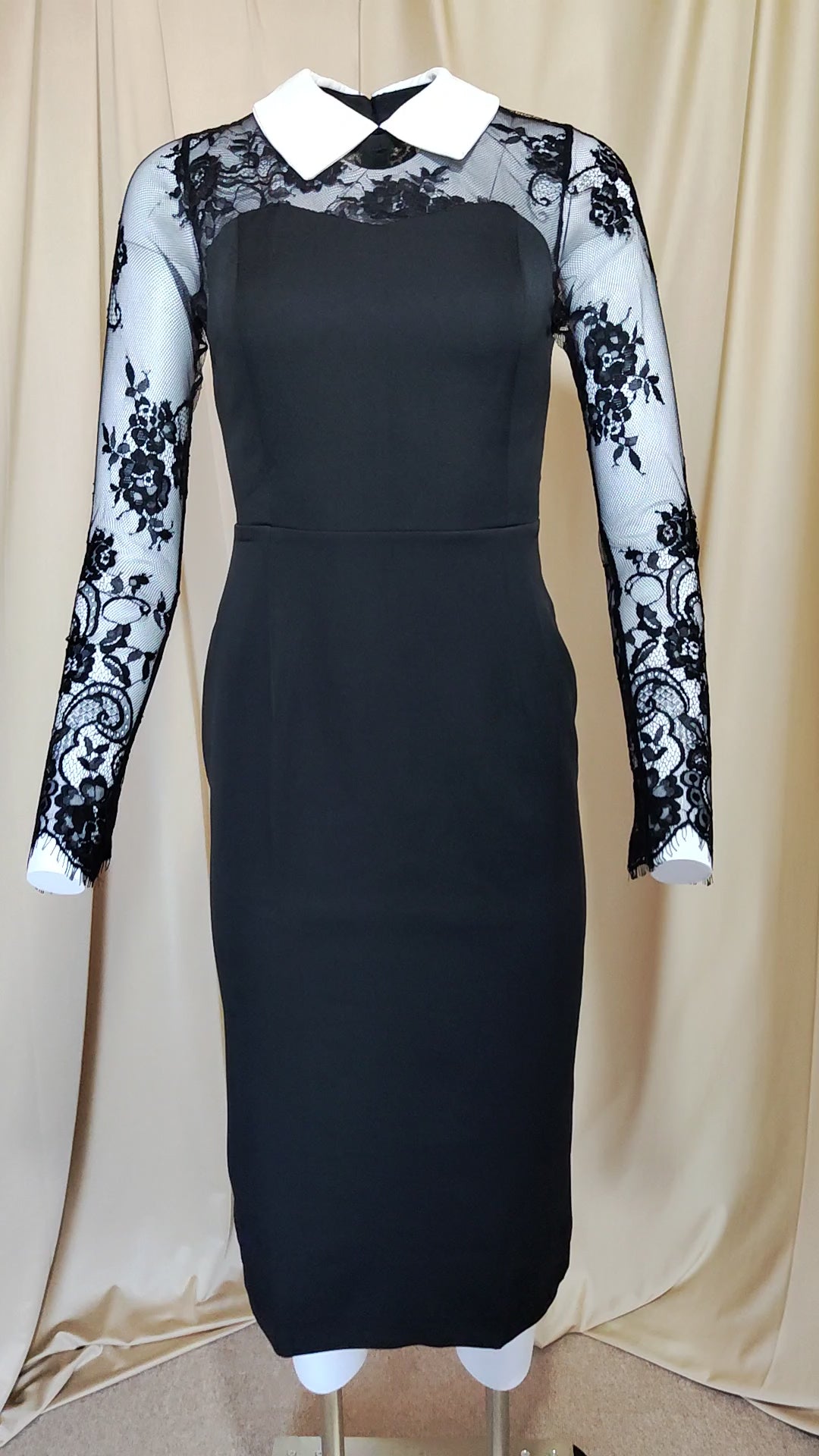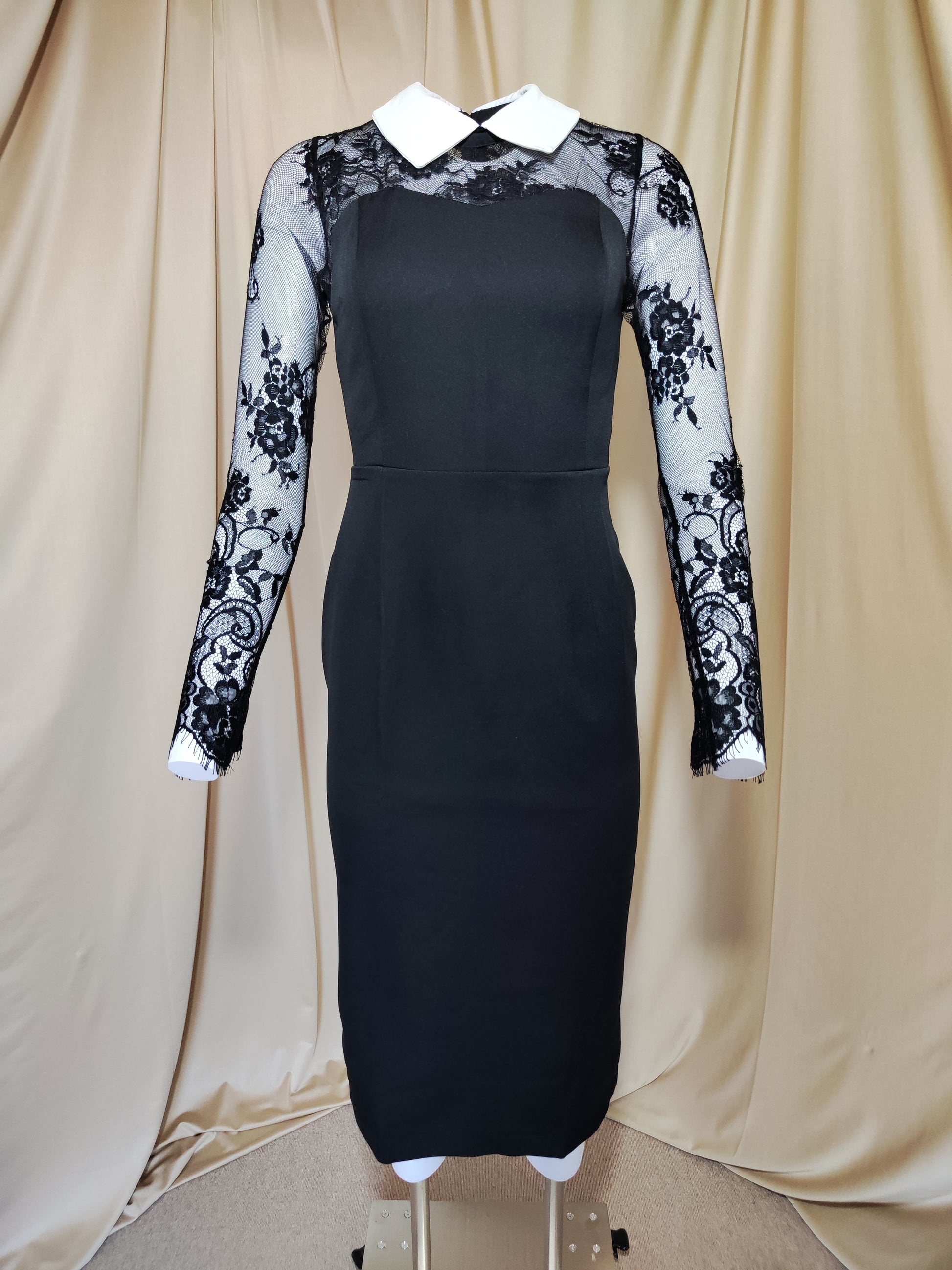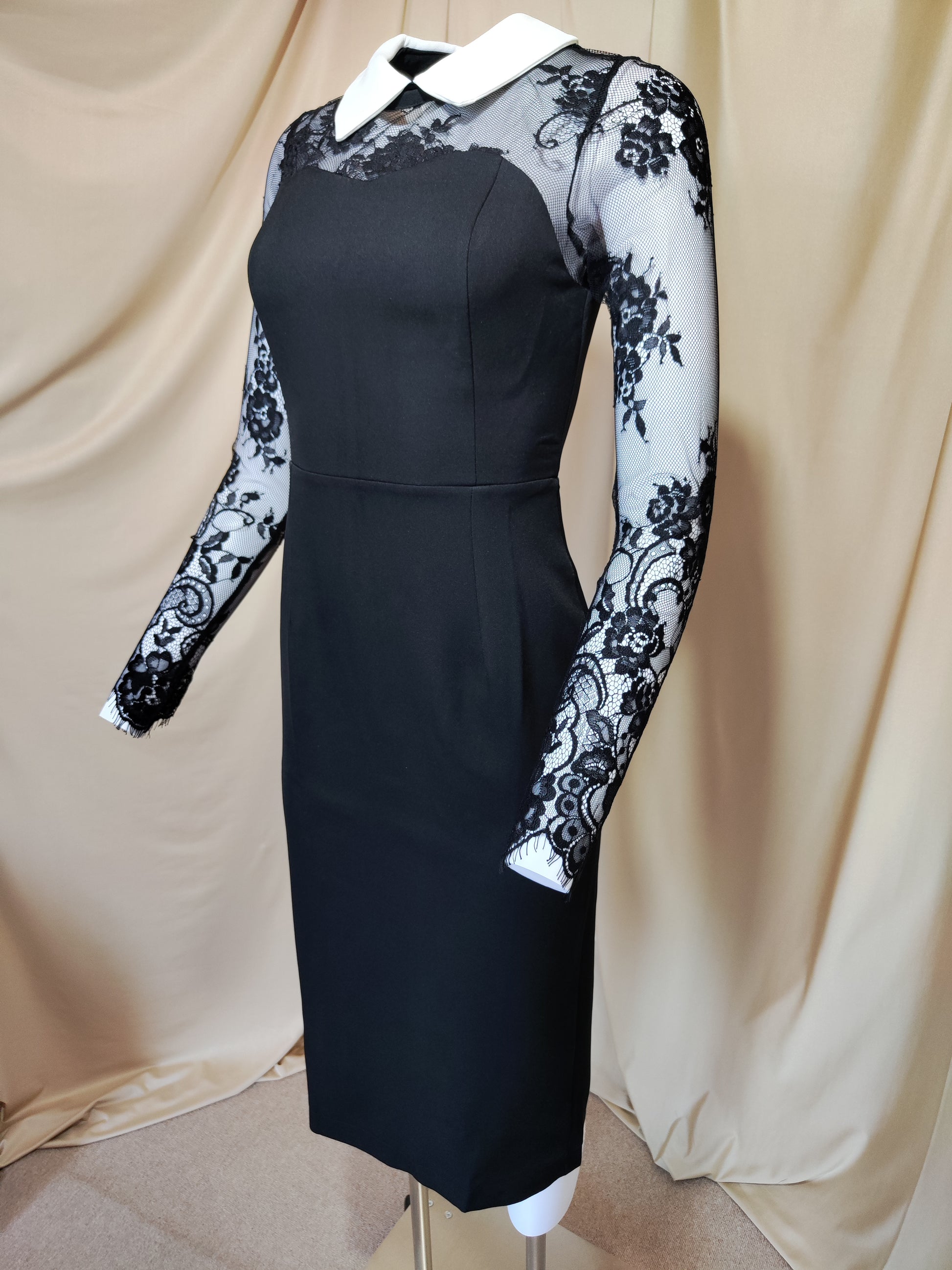 Elegantna crna haljina s čipkastim rukavima i bijelim ovratnikom. Uski kroj savršeno ističe figuru, čineći je idealnom za posebne prilike ili večernje izlaske.