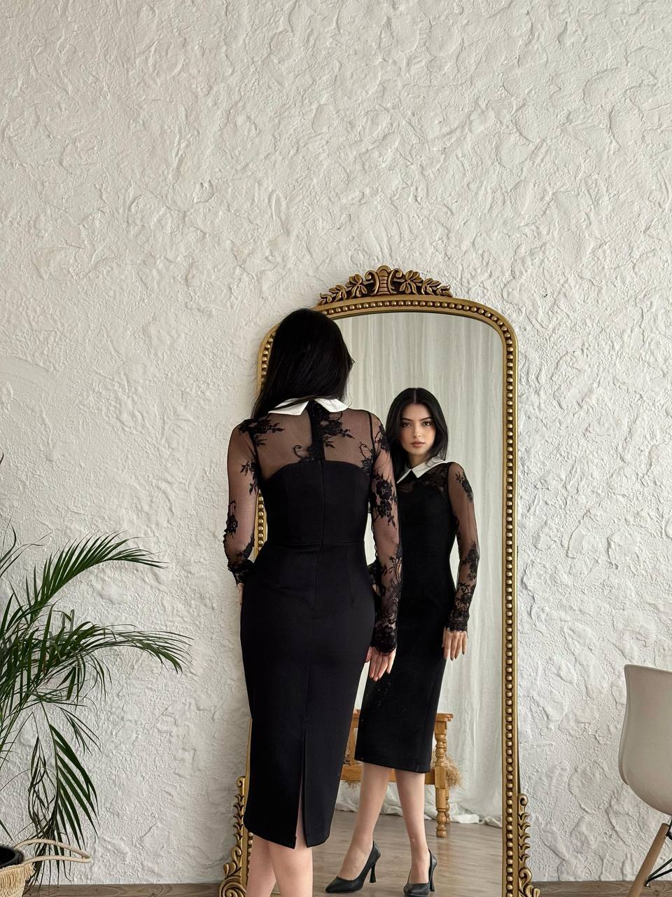 Ova elegantna crna haljina odiše profinjenošću zahvaljujući dugim čipkastim rukavima i gornjem dijelu od prozirne mrežice s cvjetnim detaljima. Kontrastni bijeli ovratnik daje joj klasičan i sofisticiran izgled. Zahvaljujući uskom kroju koji prati liniju tijela, naglašava siluetu i pruža ženstven i moderan dojam. Savršen izbor za svečane prigode, poslovne večere ili večernje izlaske uz elegantne modne dodatke.