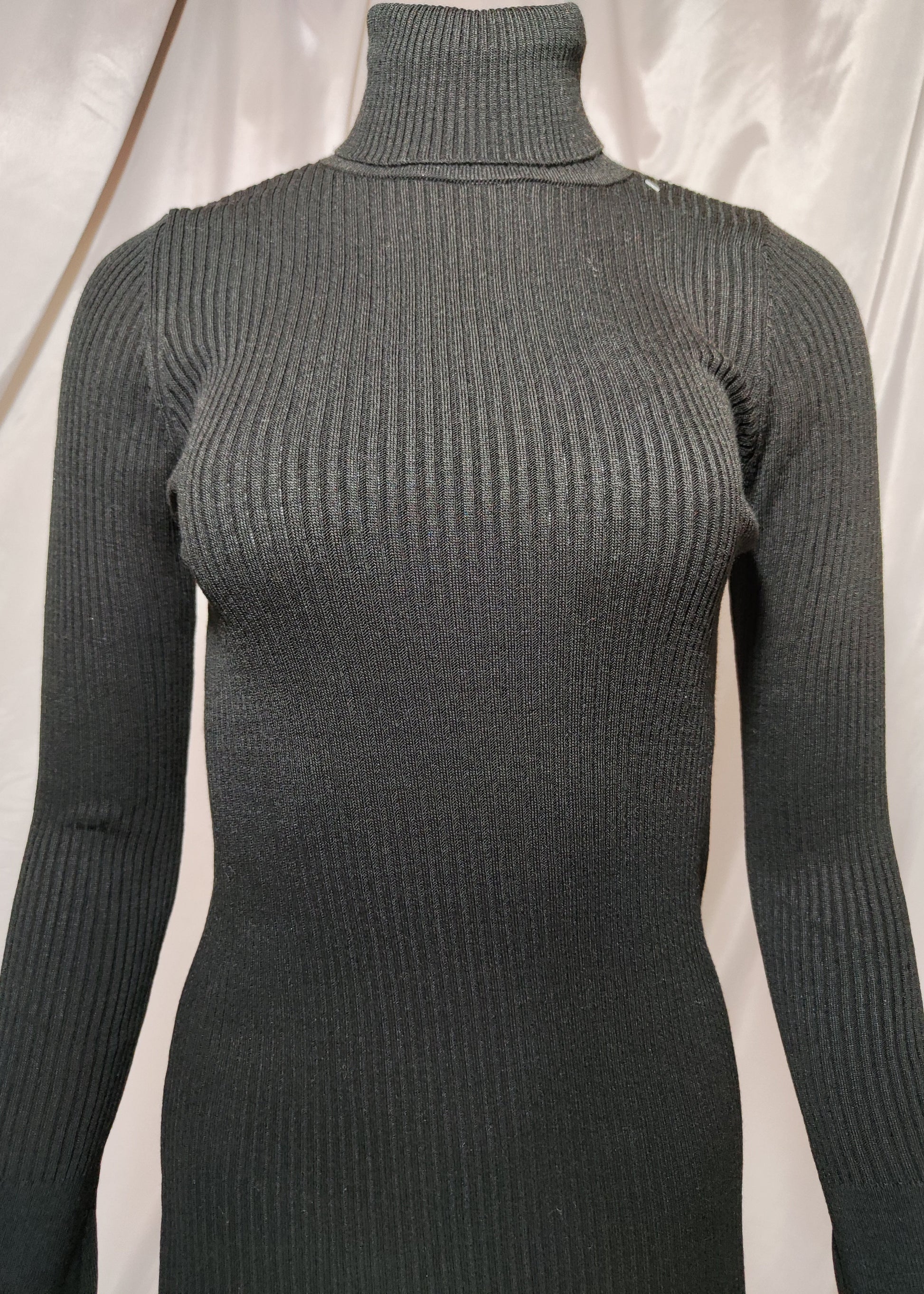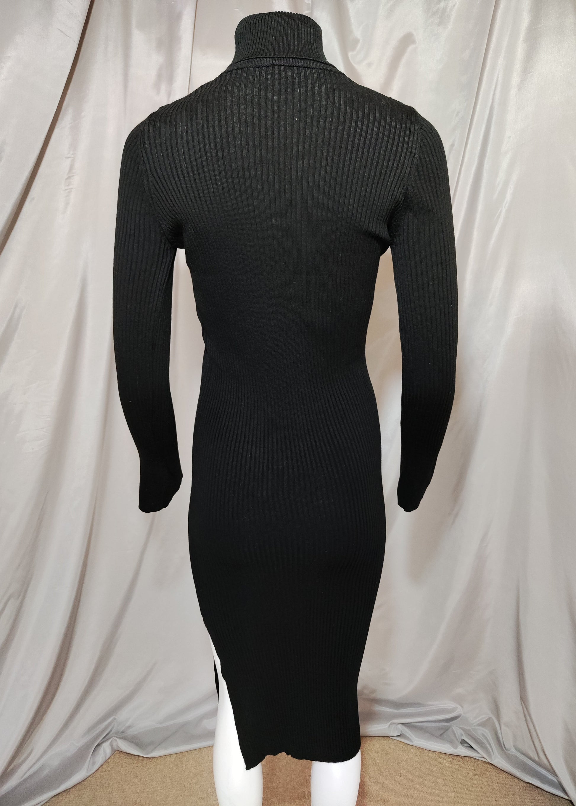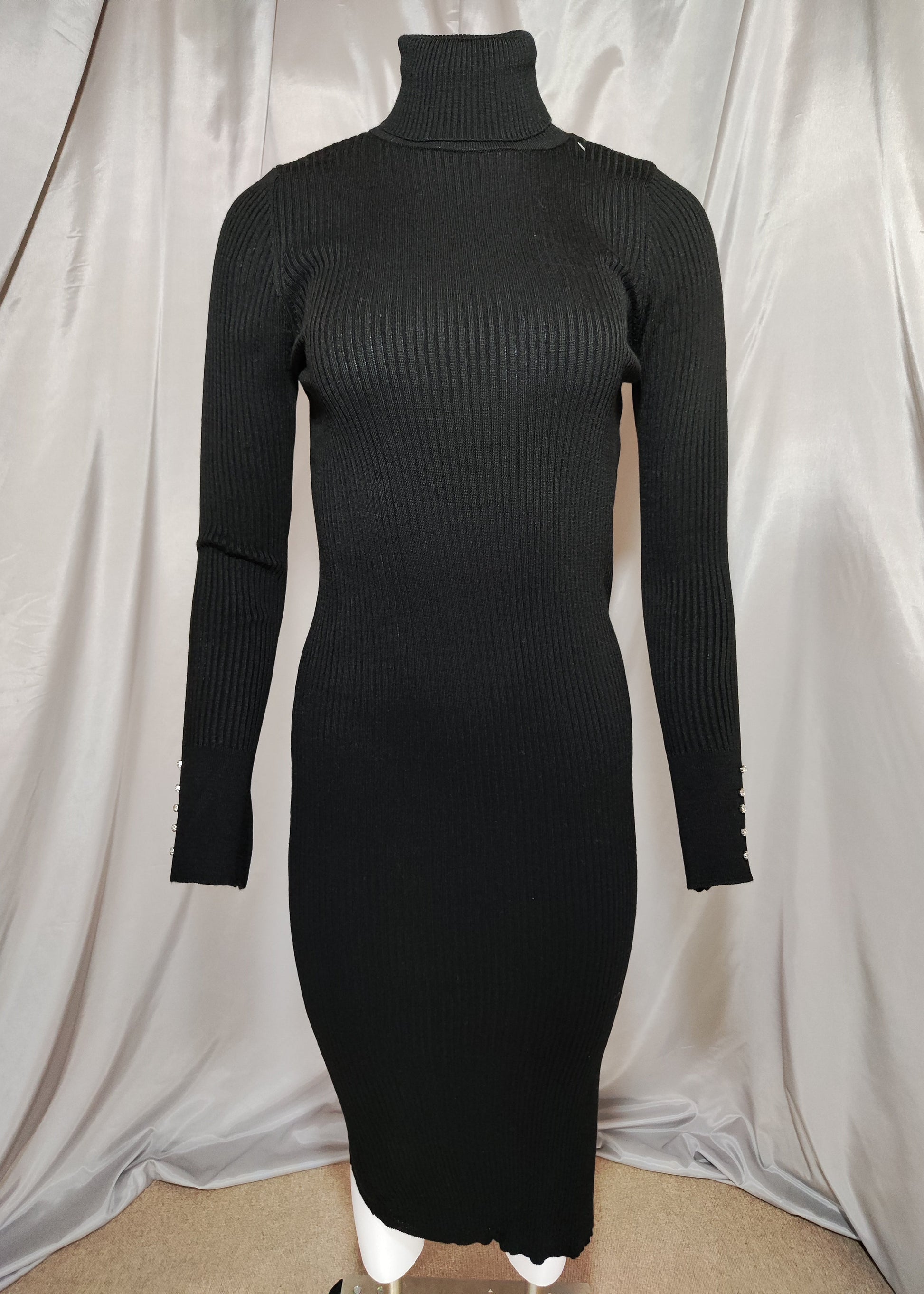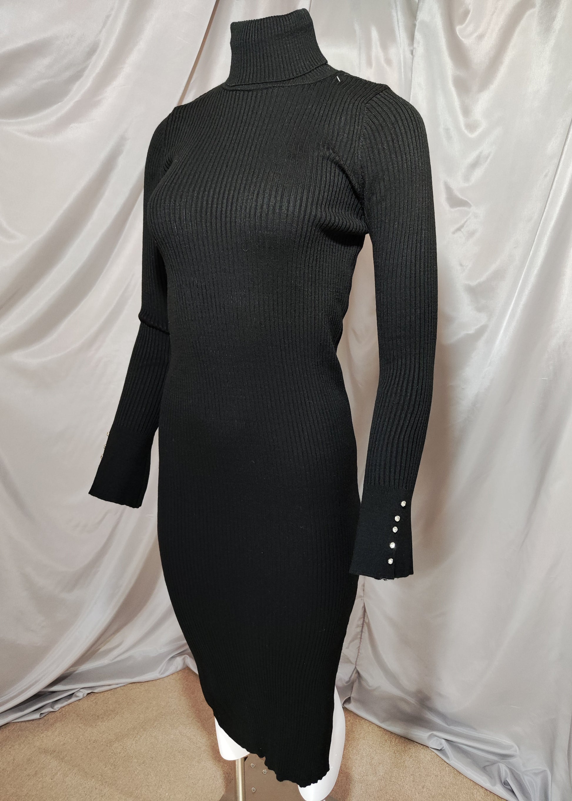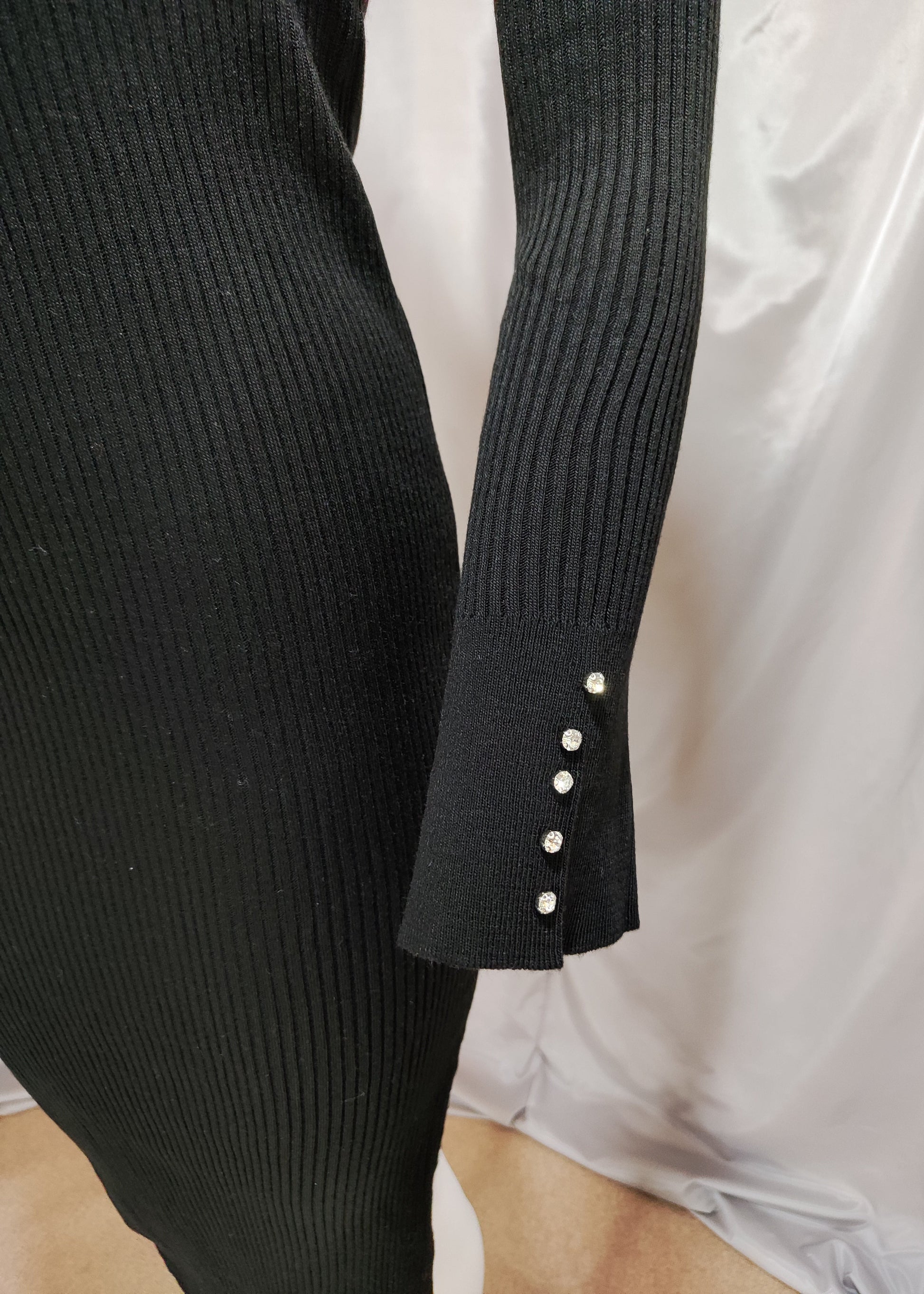 Crna rebrasta haljina s visokim ovratnikom i cirkonima na rukavima