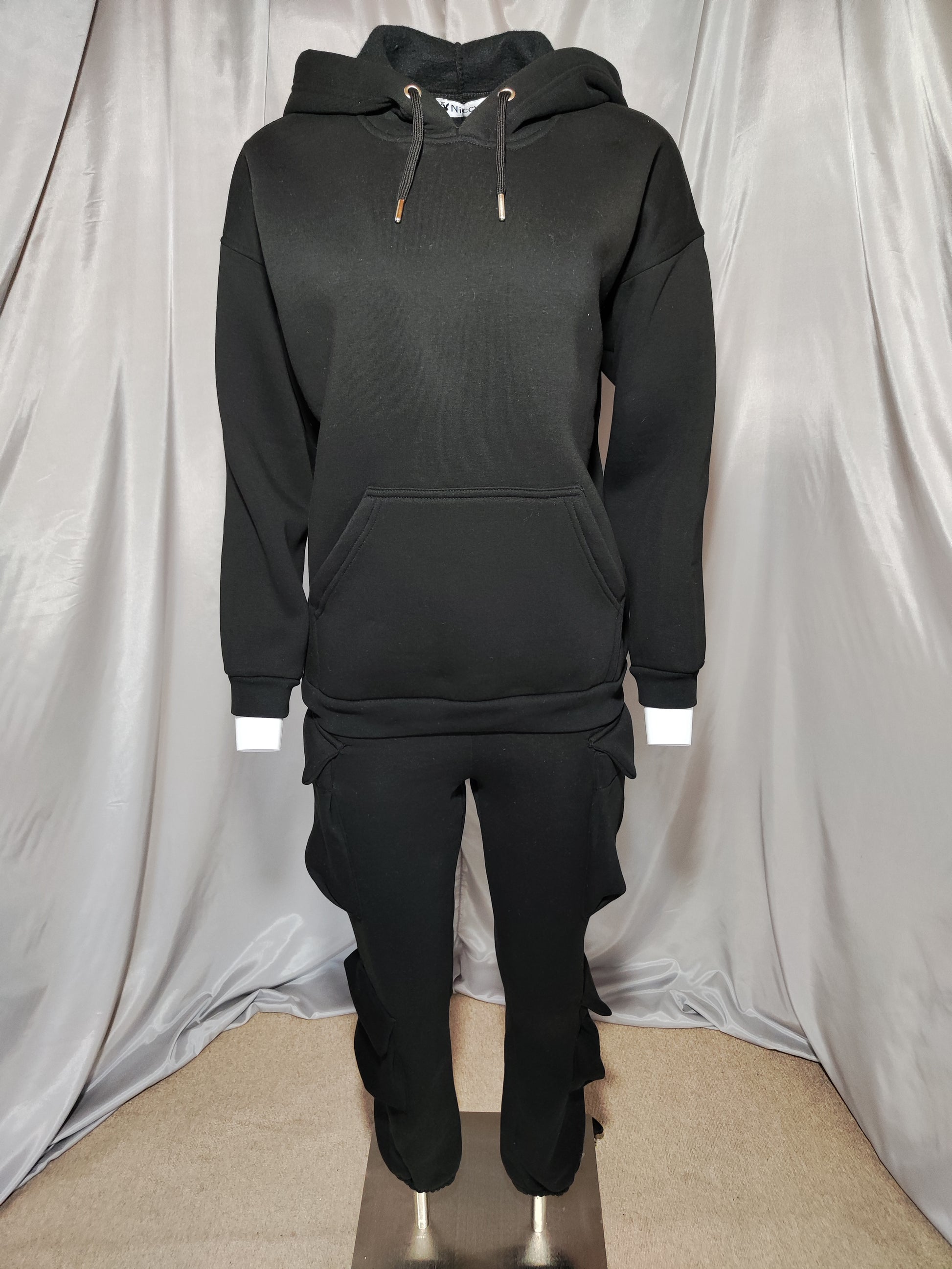 Udobna i moderna trenirka izrađena od kvalitetnog materijala. Gornji dio je klasična dukserica s kapuljačom, vezicom i praktičnim „kengur“ džepom sprijeda. Donji dio ima elastični pojas s vezicom za podešavanje, bočne džepove te elastični završetak na dnu nogavica za udobno prianjanje.
