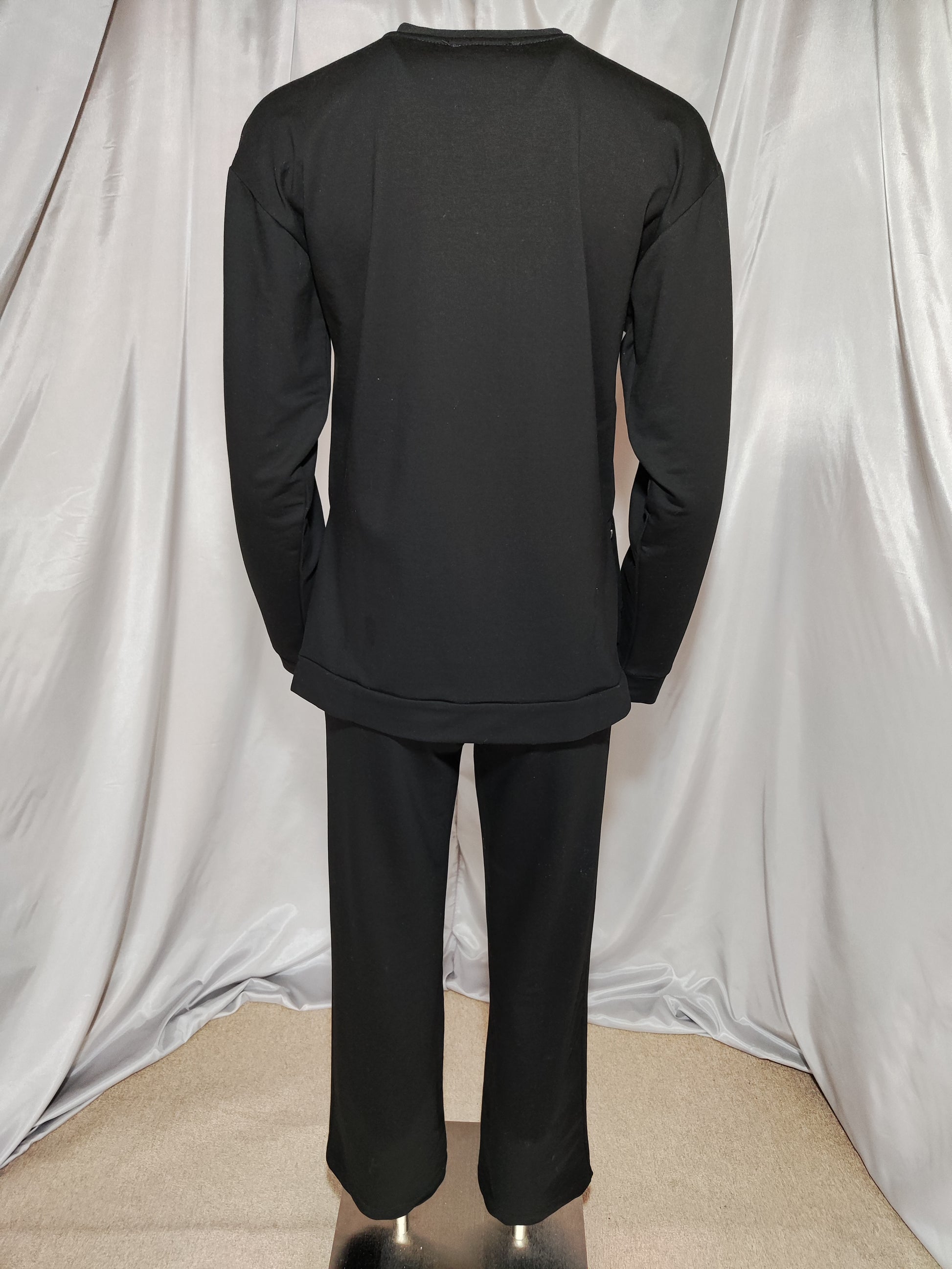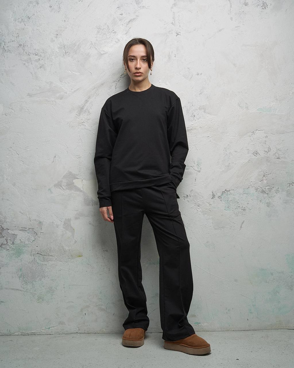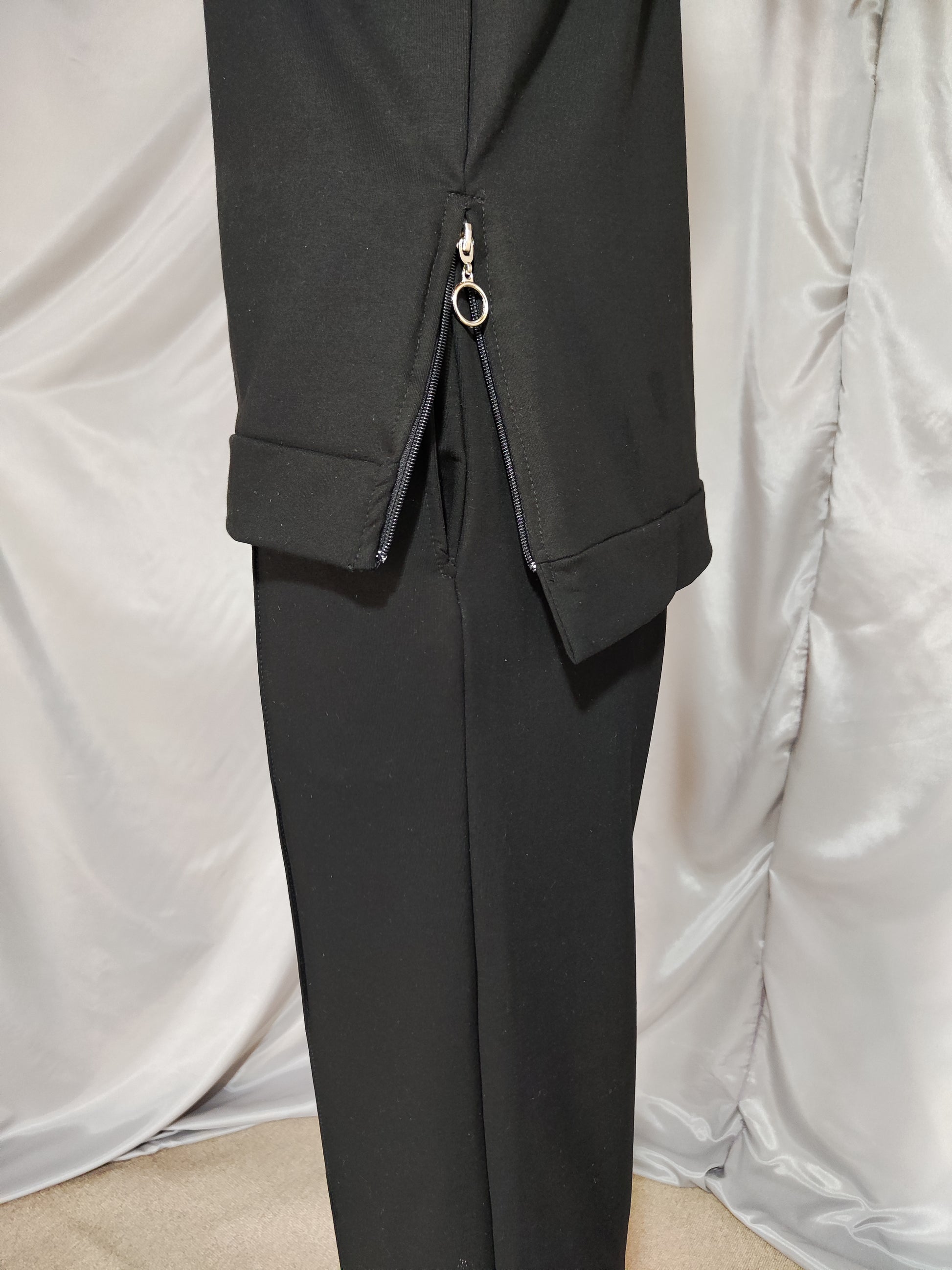 Donji dio hlača ima elastični pojas i bočne džepove. Nogavice su ravne, a po sredini je ušiven dekorativni šav koji naglašava liniju hlača.