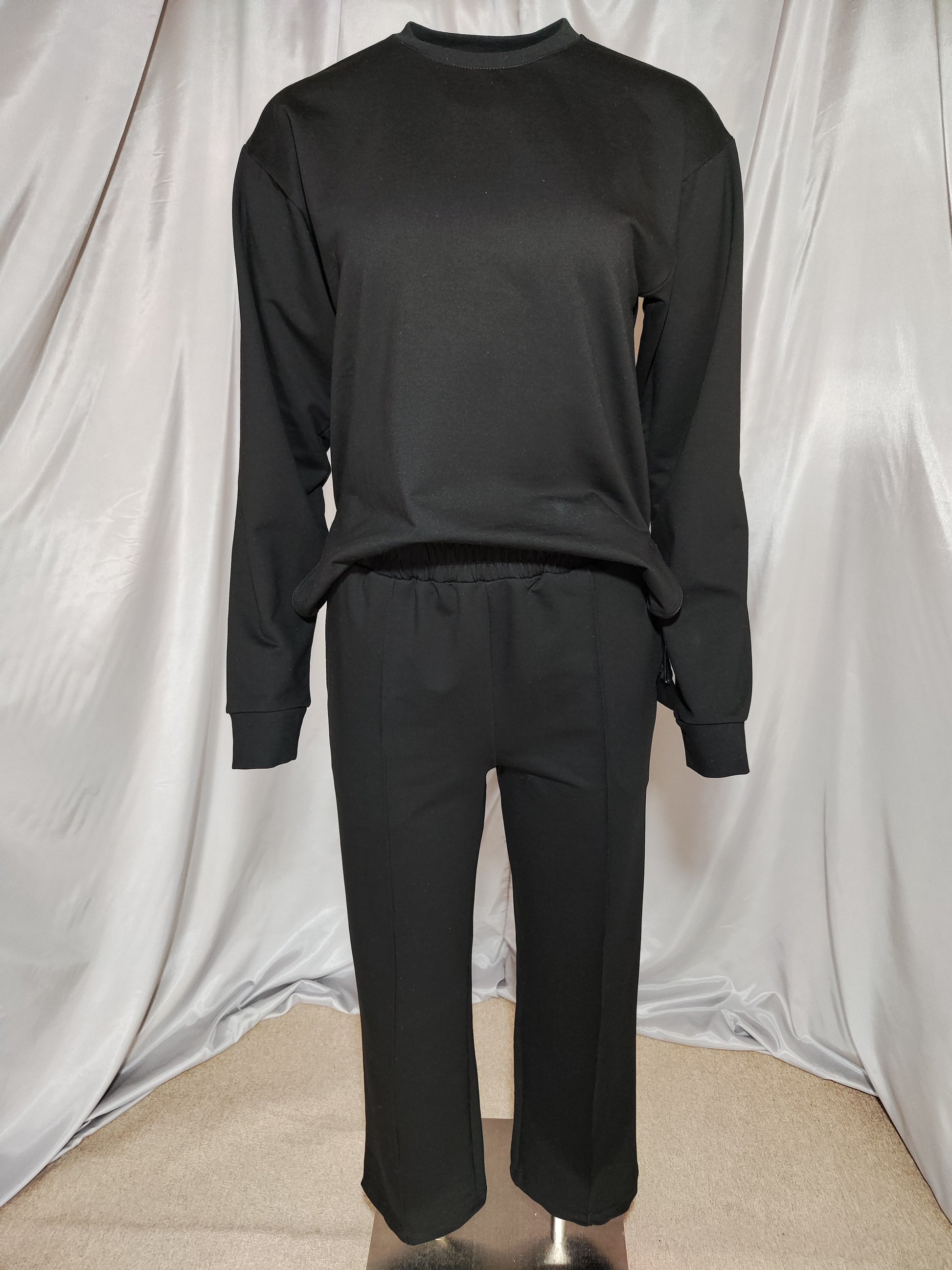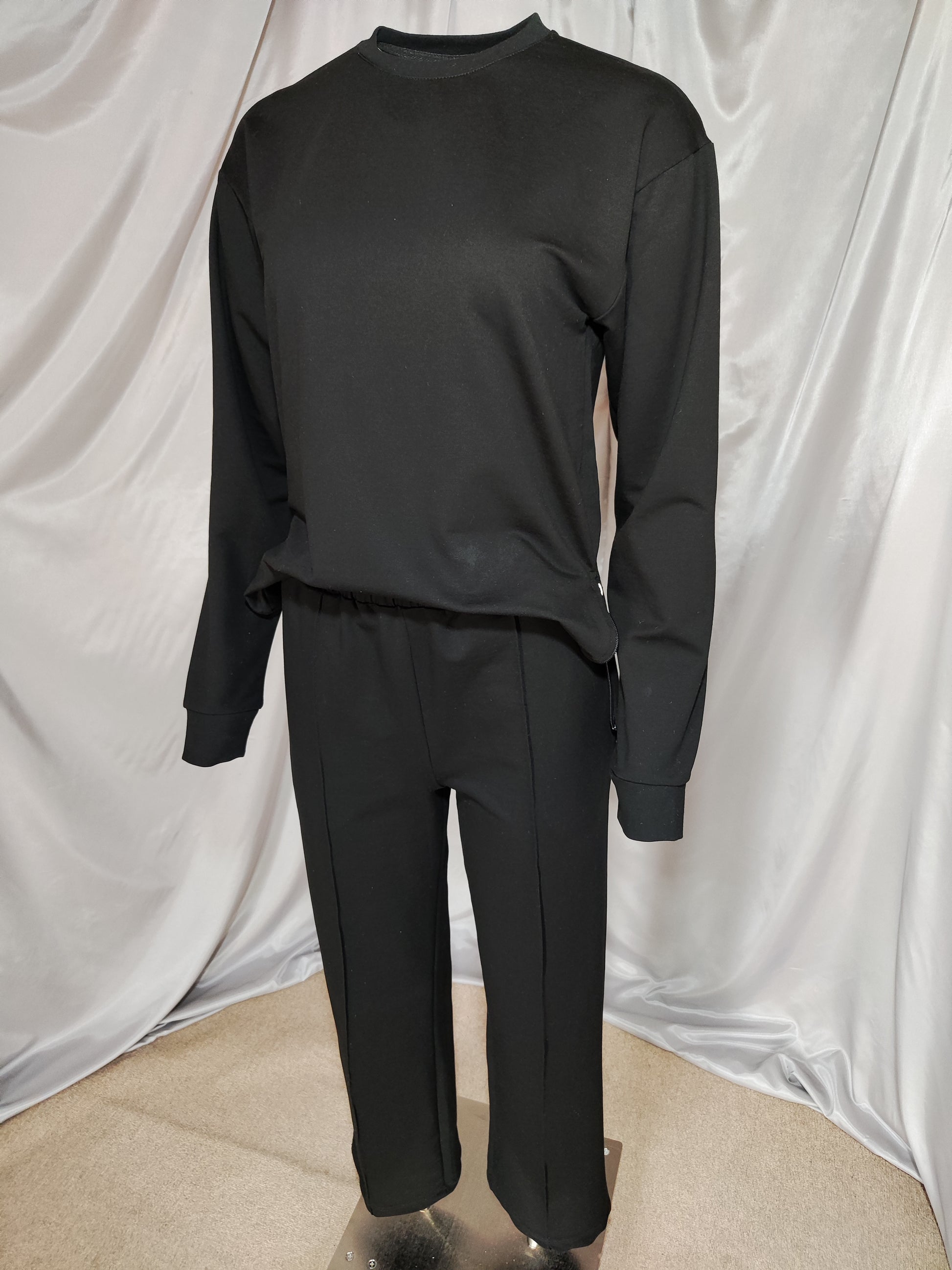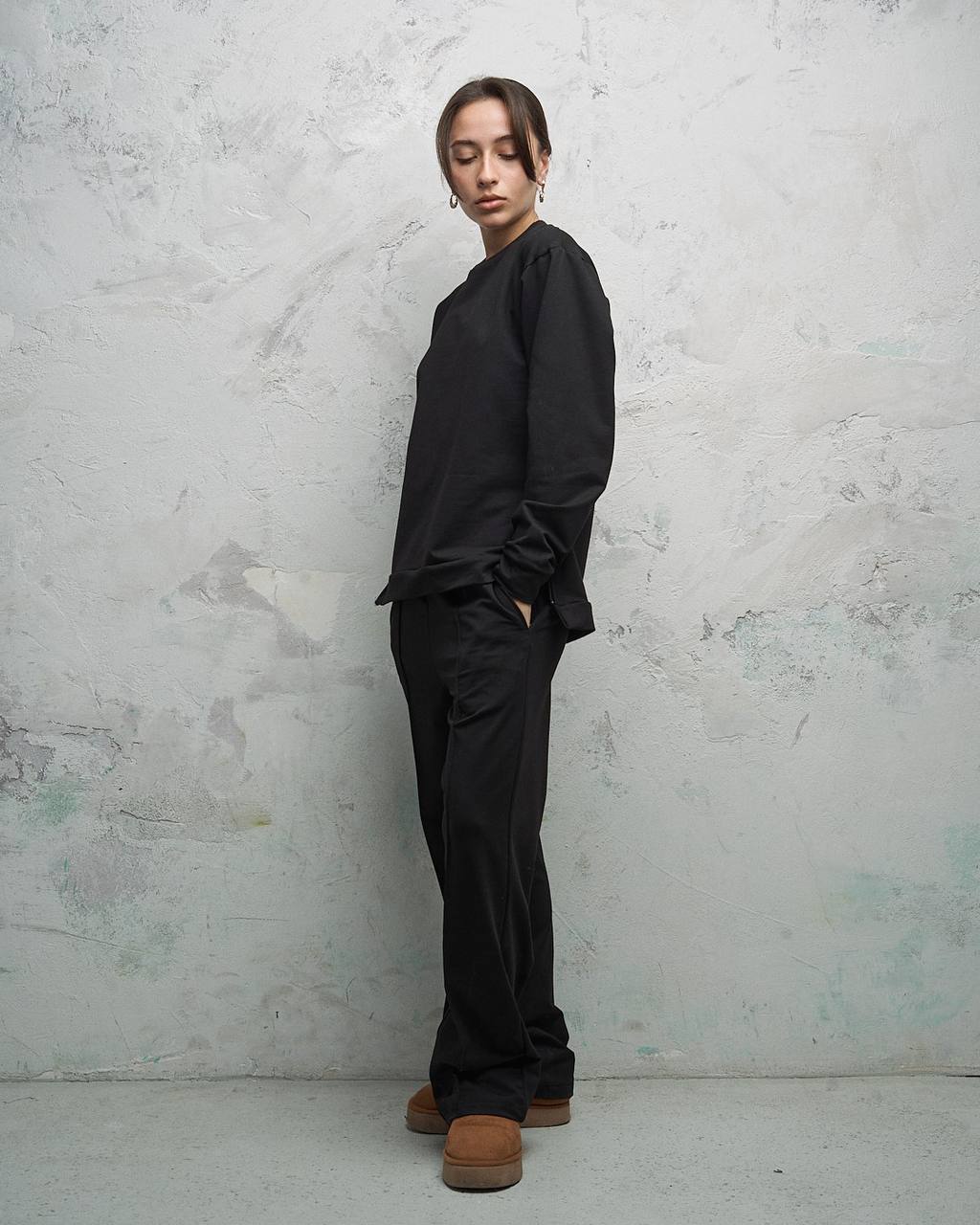 Donji dio hlača ima elastični pojas i bočne džepove. Nogavice su ravne, a po sredini je ušiven dekorativni šav koji naglašava liniju hlača.