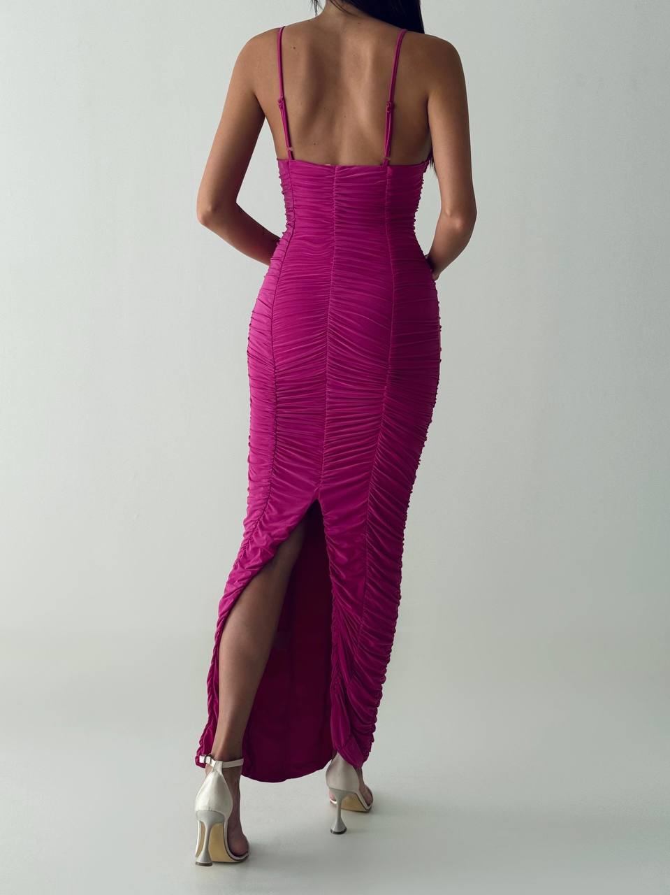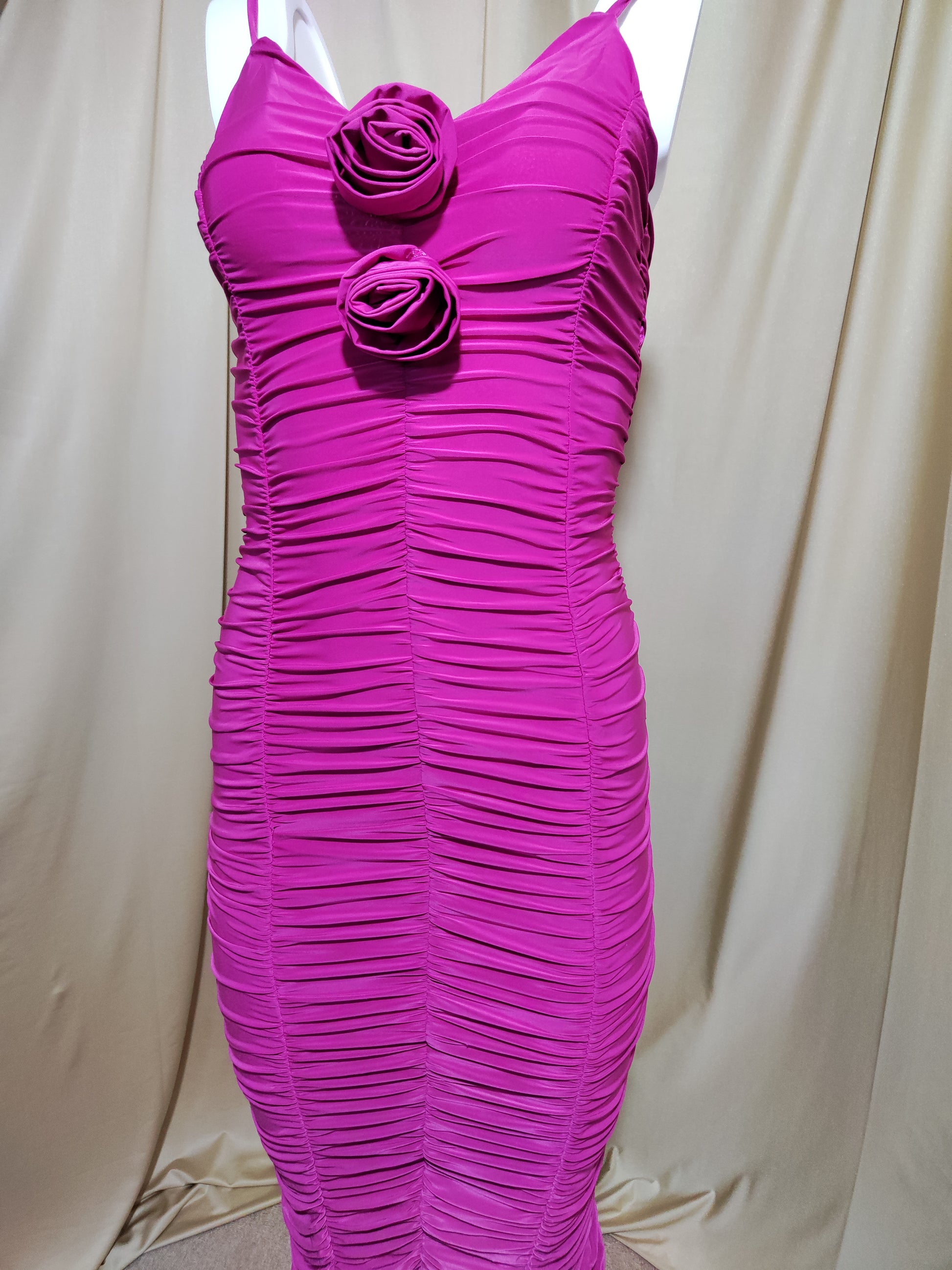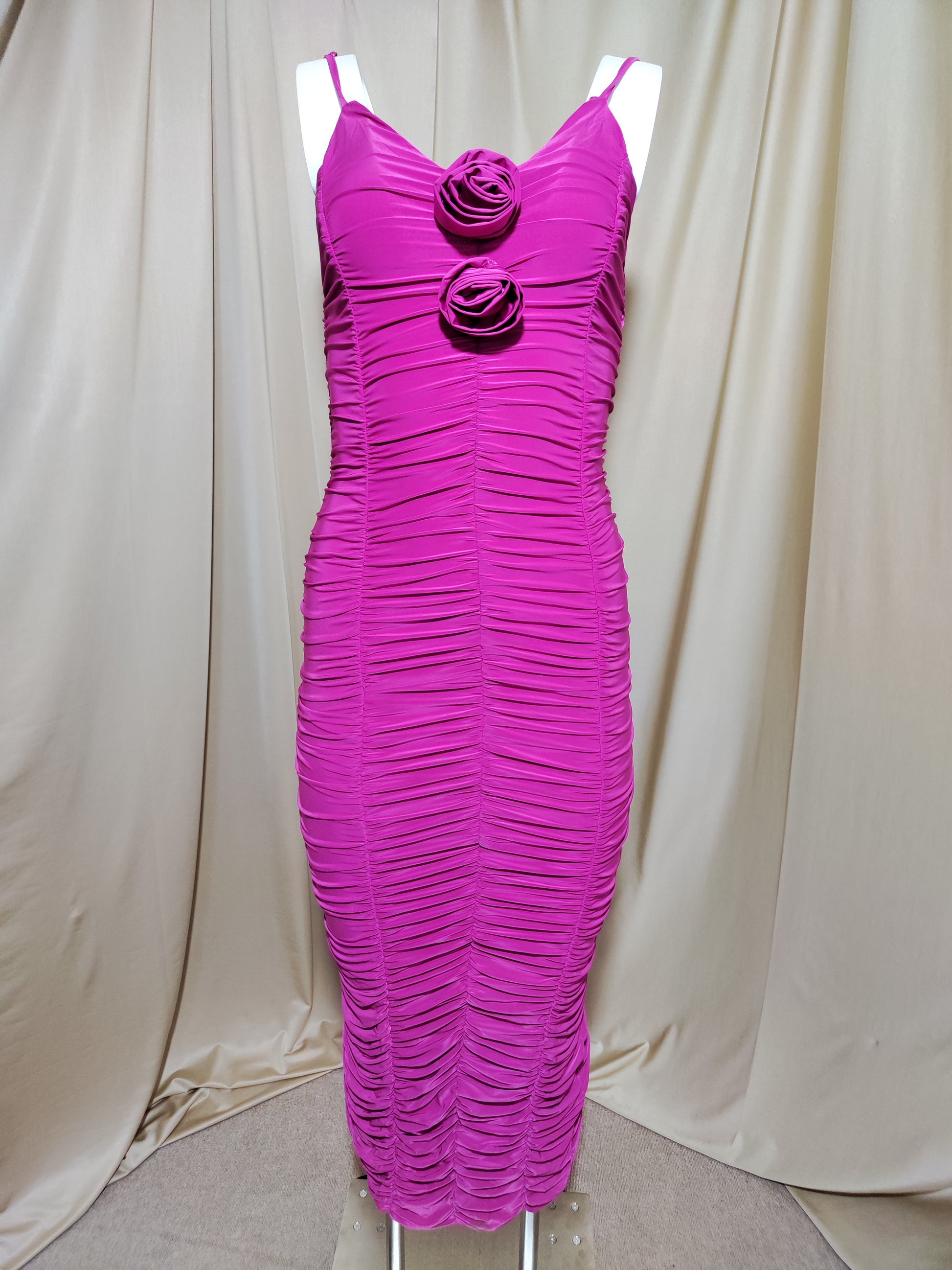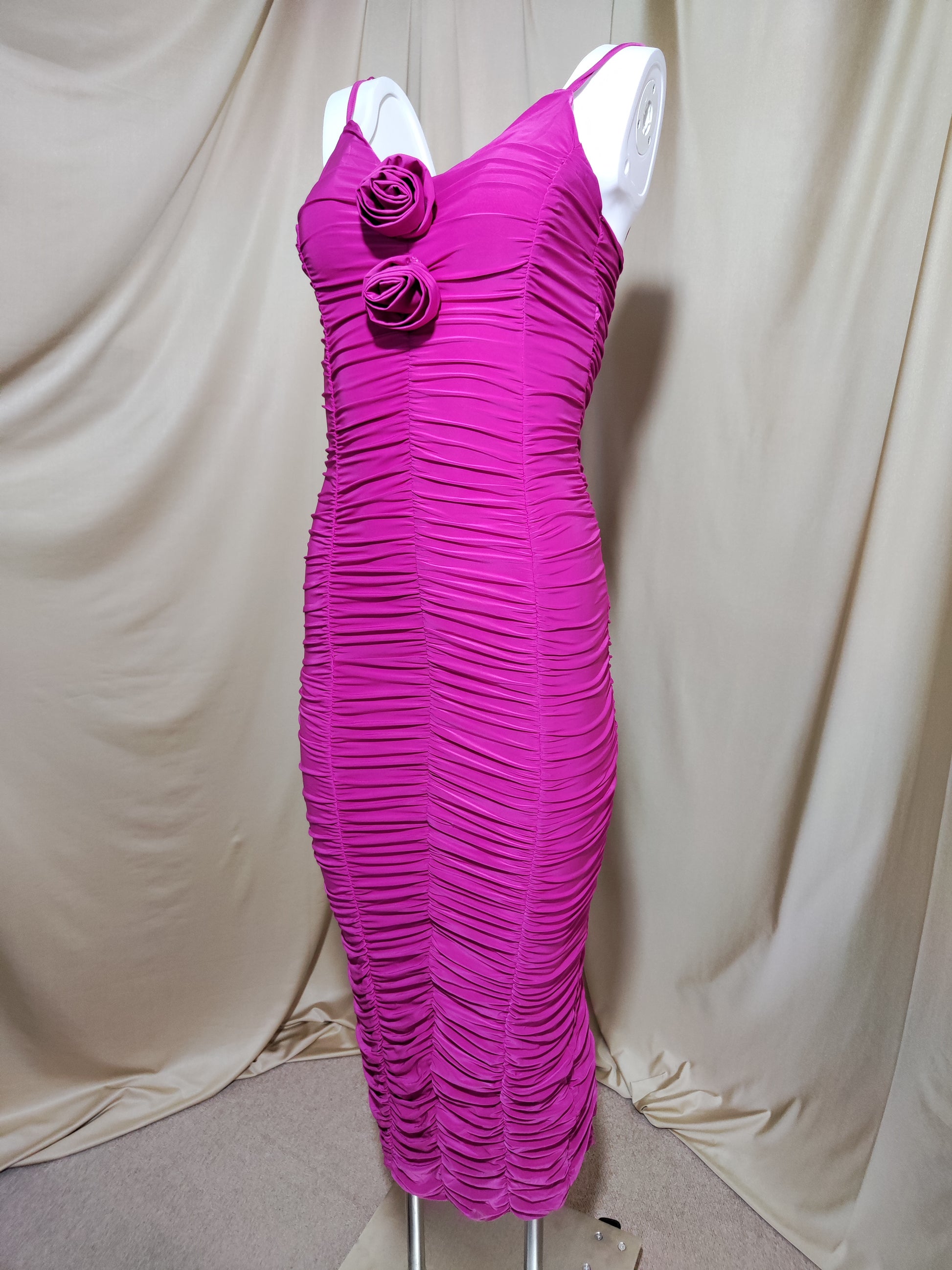 Zavodljiva midi haljina u intenzivnoj fuksija boji izrađena od elastičnog materijala koji naglašava i ističe obline. Bogati nabori duž cijele haljine oblikuju figuru, dok cvjetni detalji na dekolteu unose romantičan i ženstven izgled.