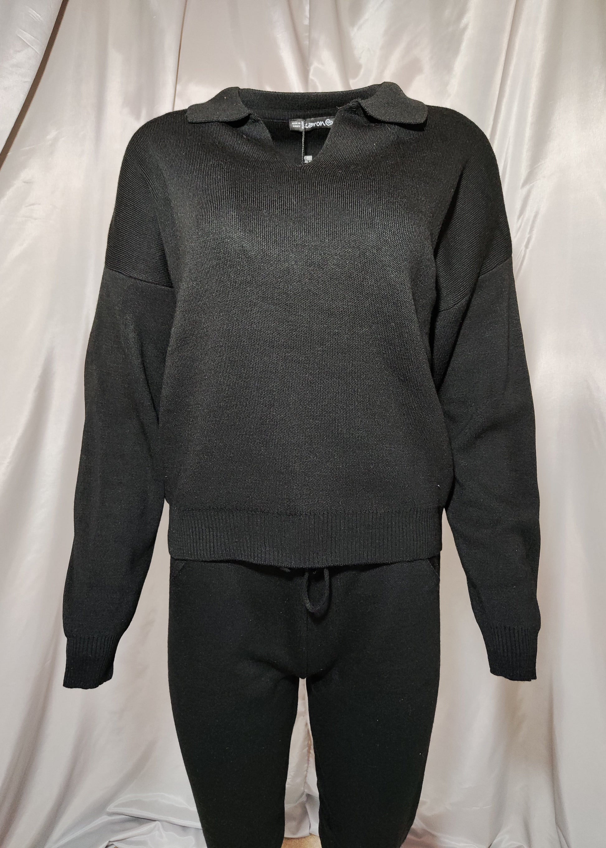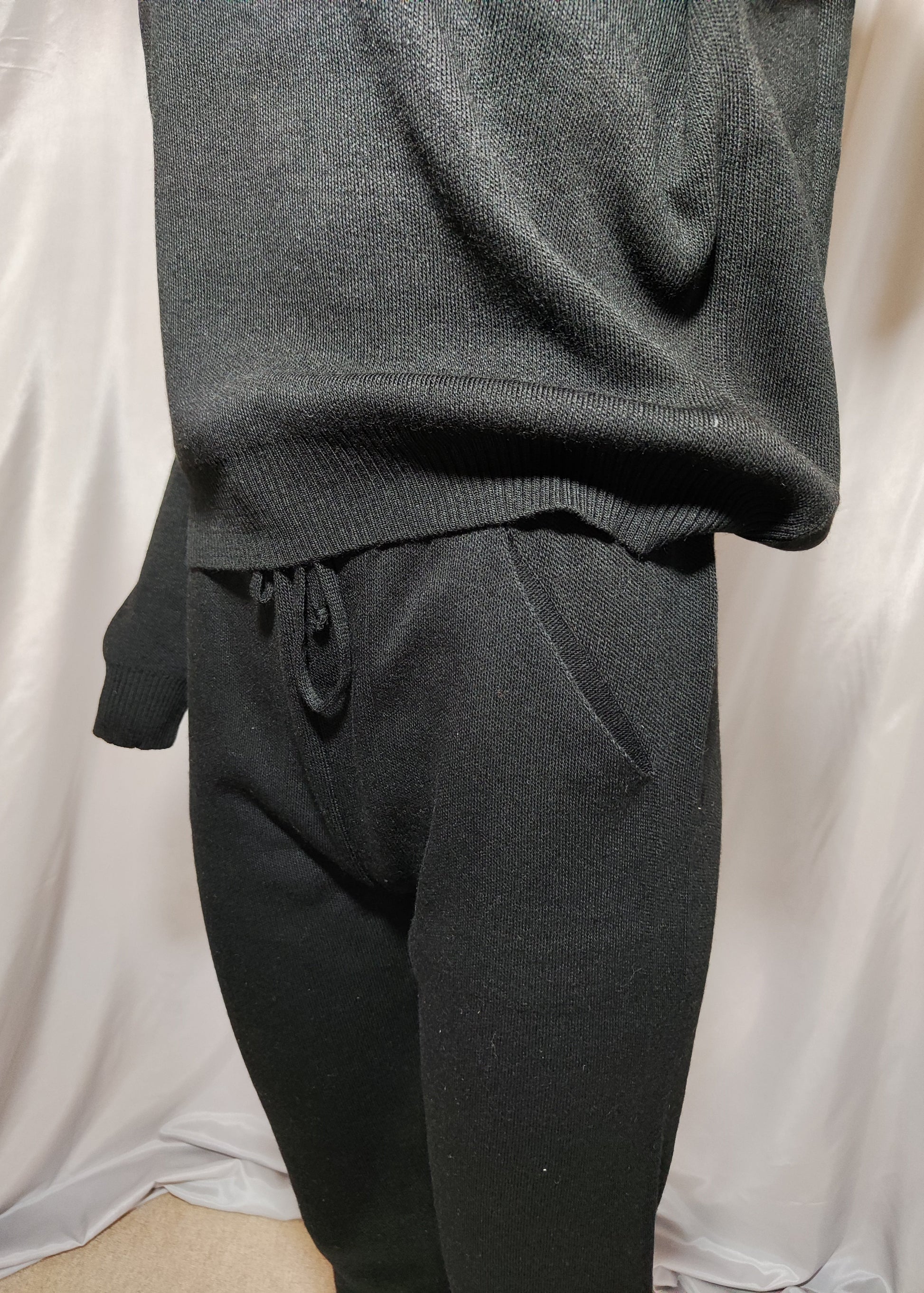 Udoban i moderan crni pleteni komplet, savršen za svakodnevno nošenje. Sastoji se od džempera s kragnom i hlača s vezicom u struku.
