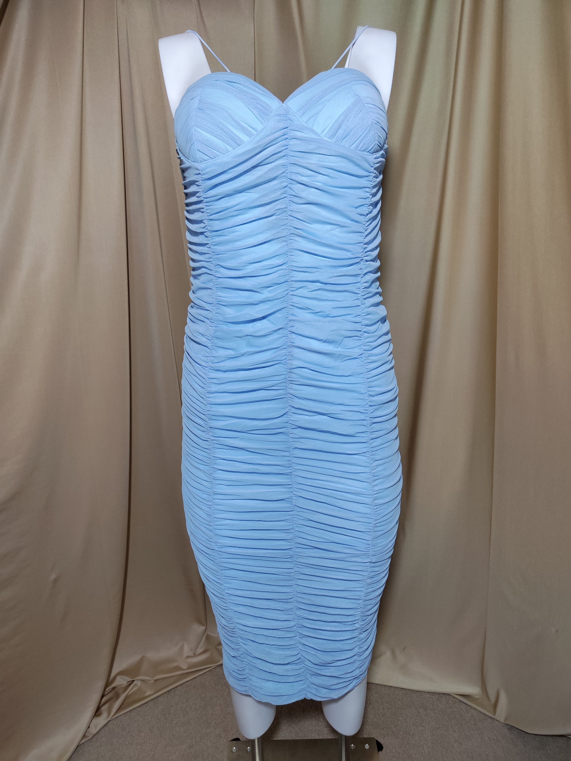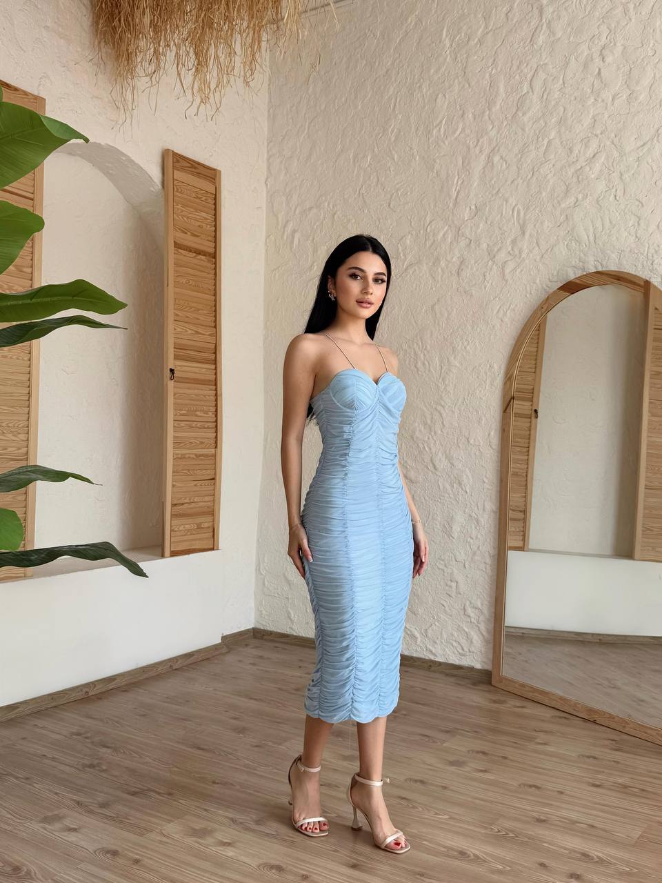 Elegantna plava haljina s tankim bretelama i efektom nabora. Savršeno naglašava obline i pruža ženstven, zavodljiv izgled.