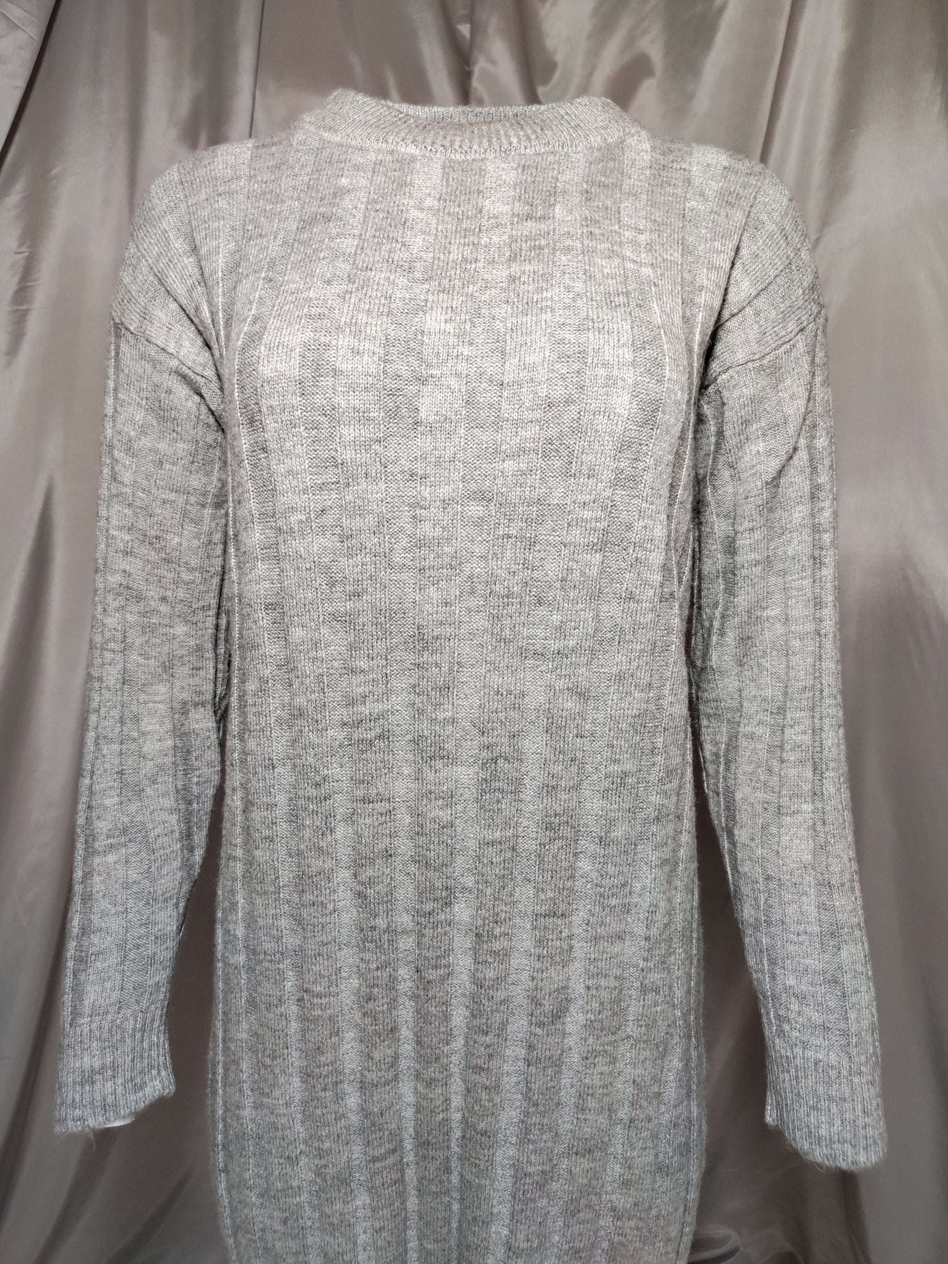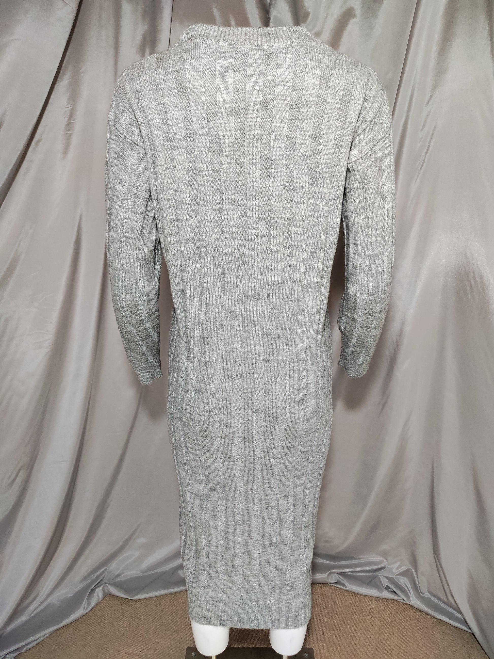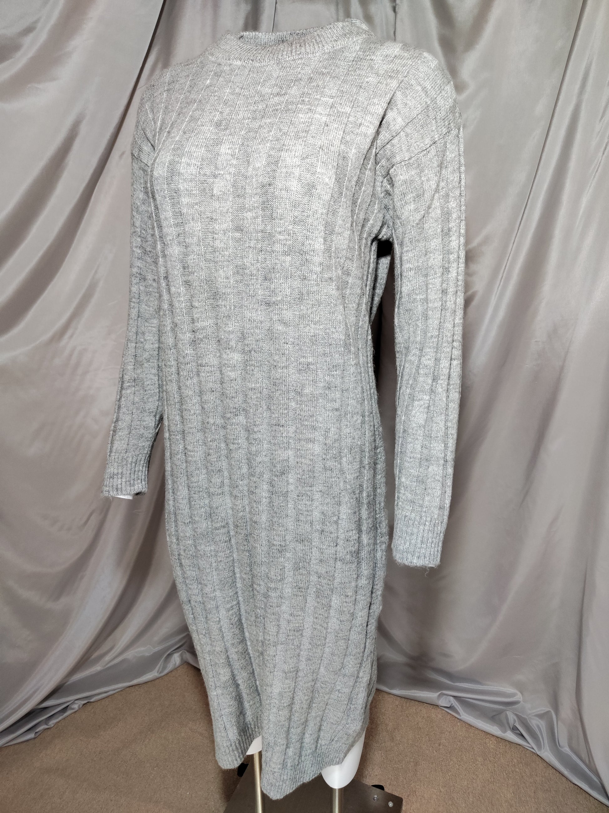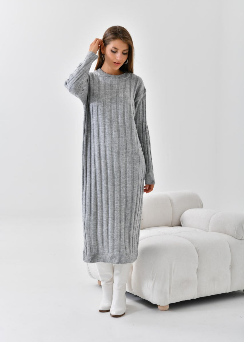 Jednostavna i udobna haljina, izrađena od mekanog pletenog materijala u sivoj nijansi.