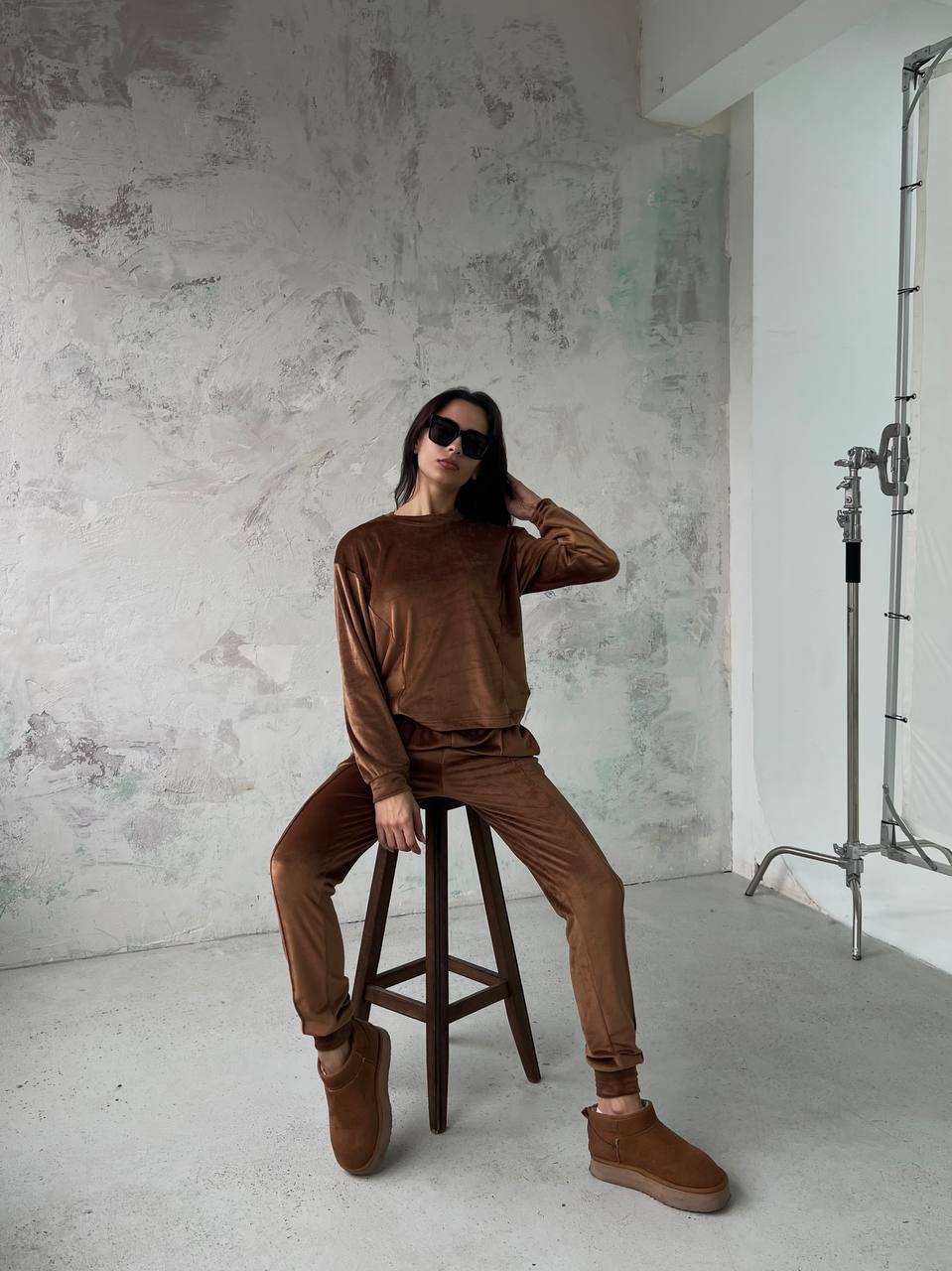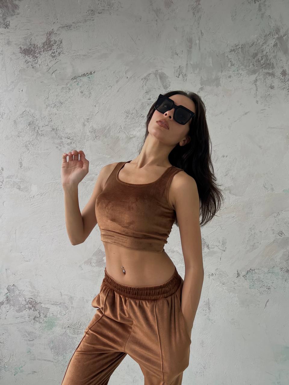 Moderan komplet od tri dijela izrađen od mekanog i udobnog materijala. Sastoji se od crop topa bez rukava, dugih hlača i majice dugih rukava. Hlače imaju elastičan pojas i praktične bočne džepove koji osiguravaju udobnost i funkcionalnost.