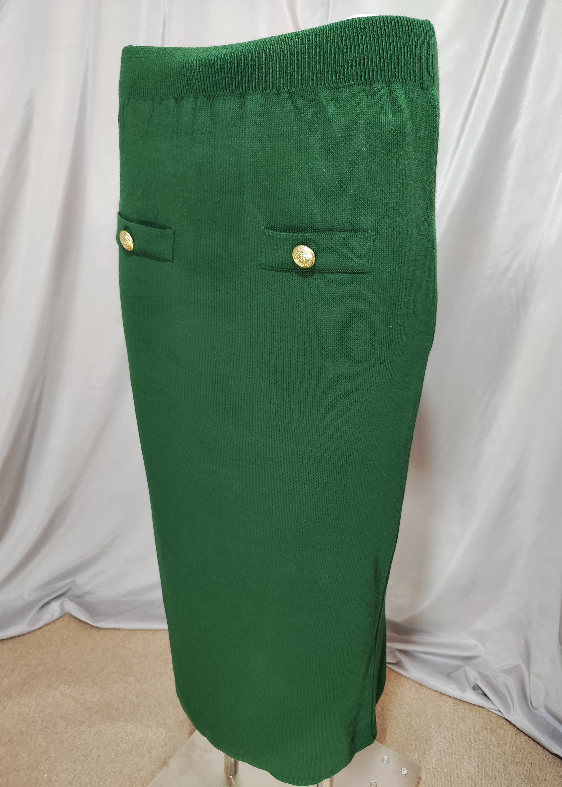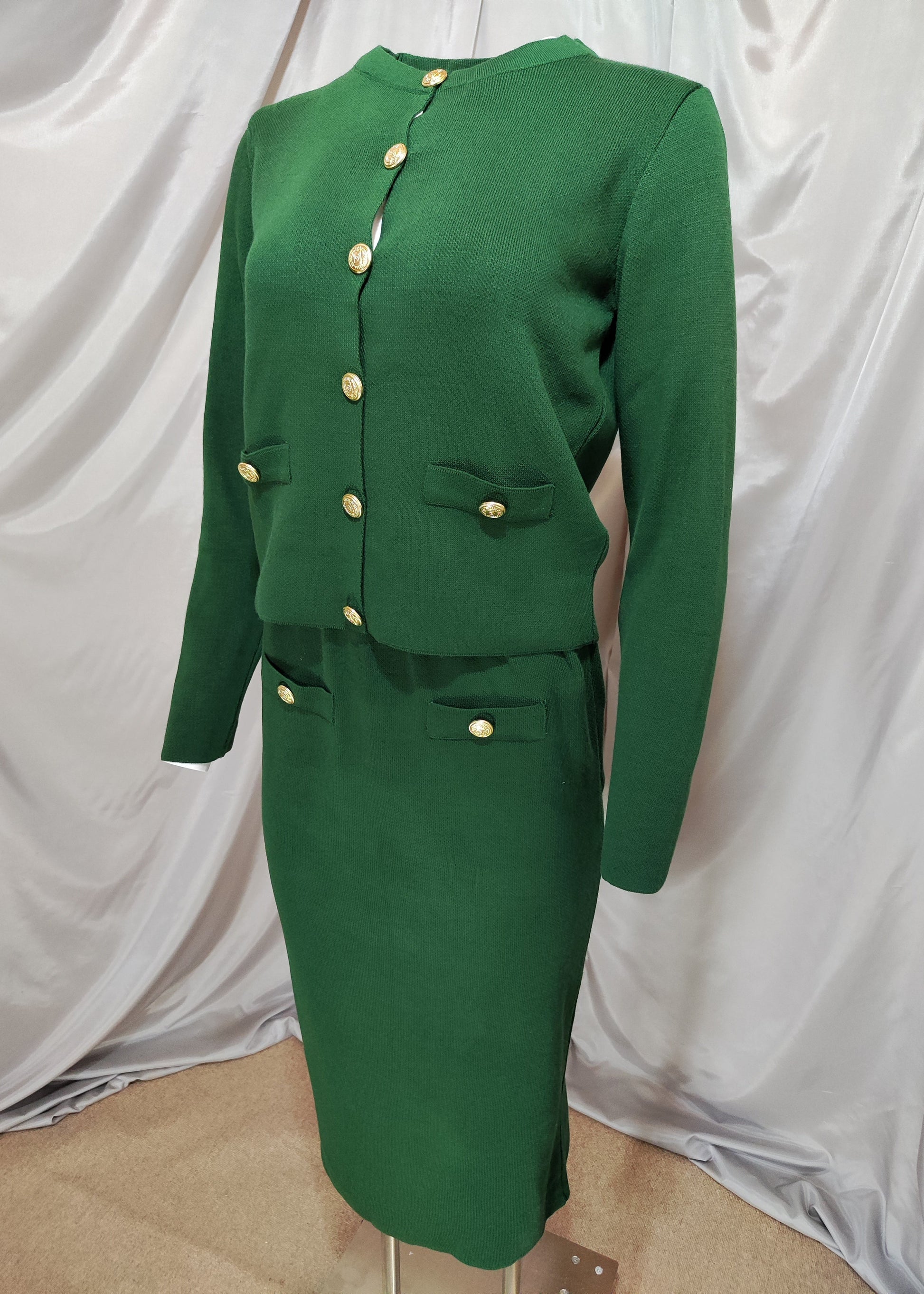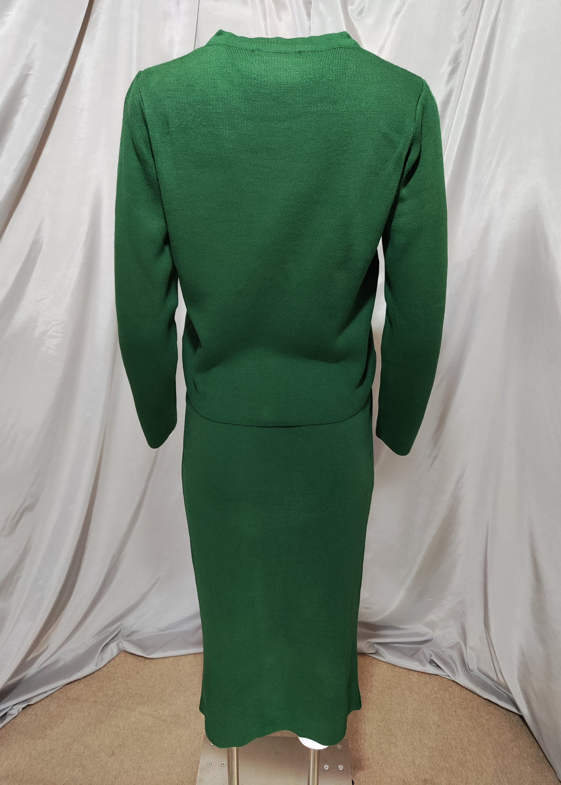 Elegantni komplet u tamnozelenoj boji sastoji se od kardigana i suknje.